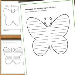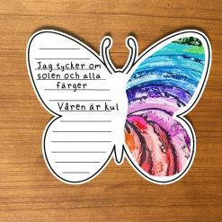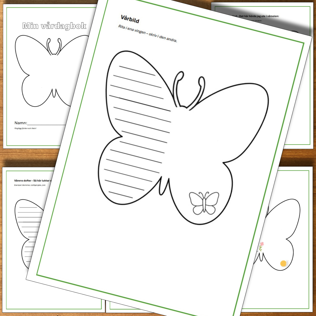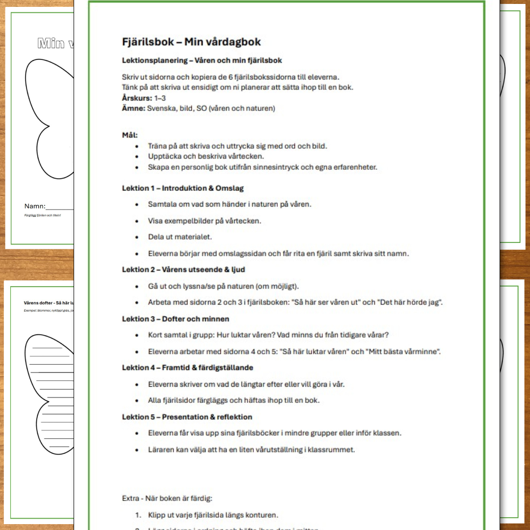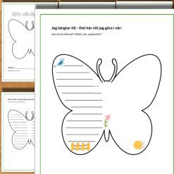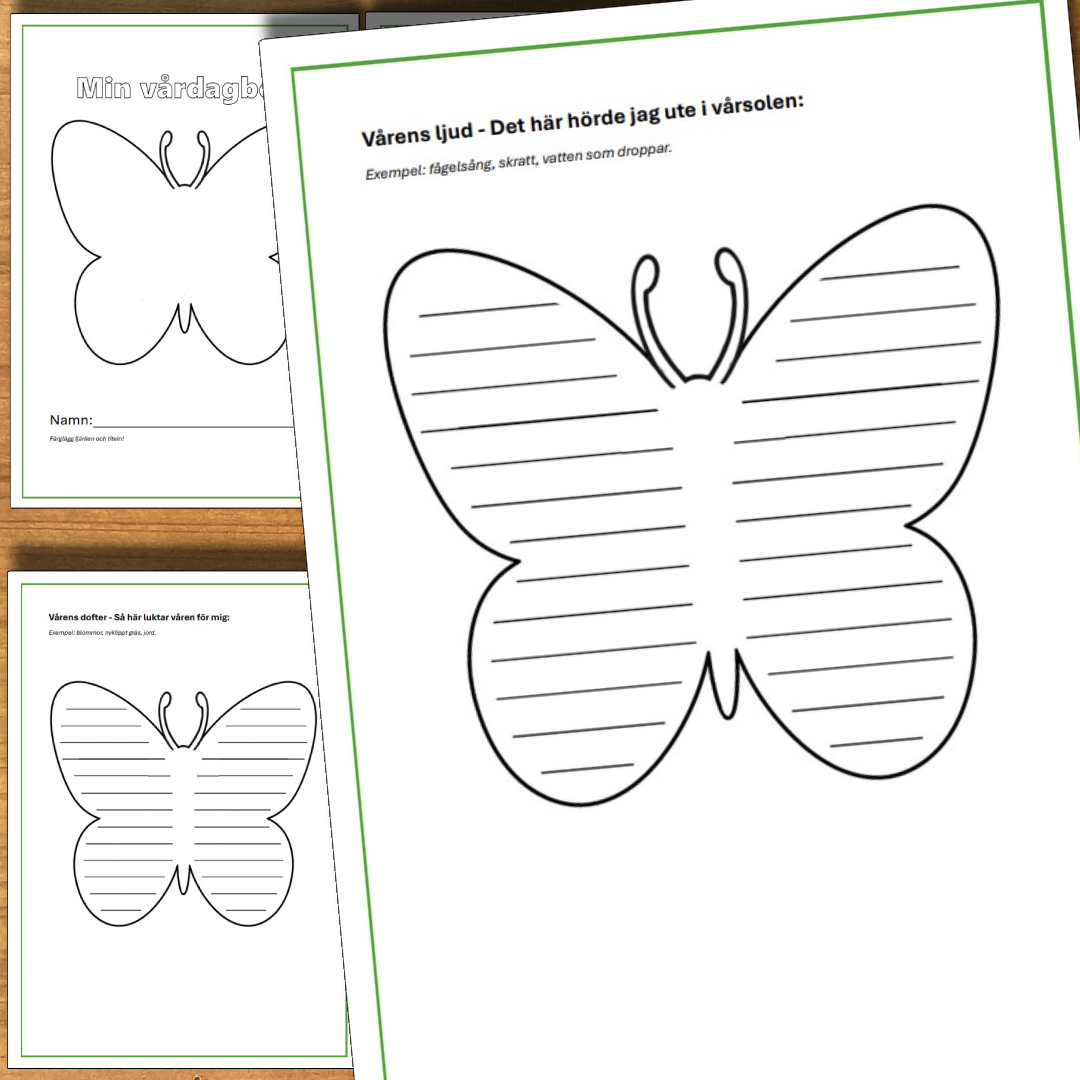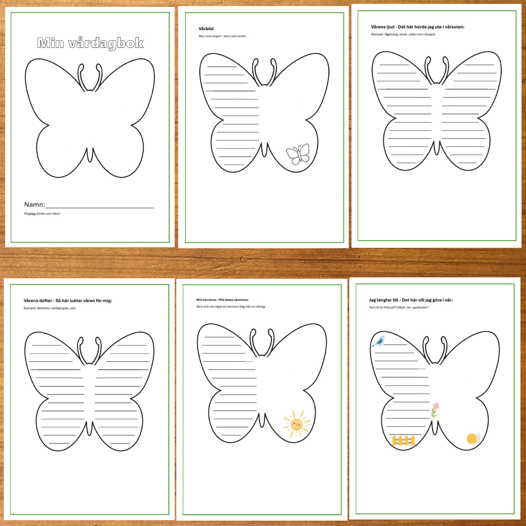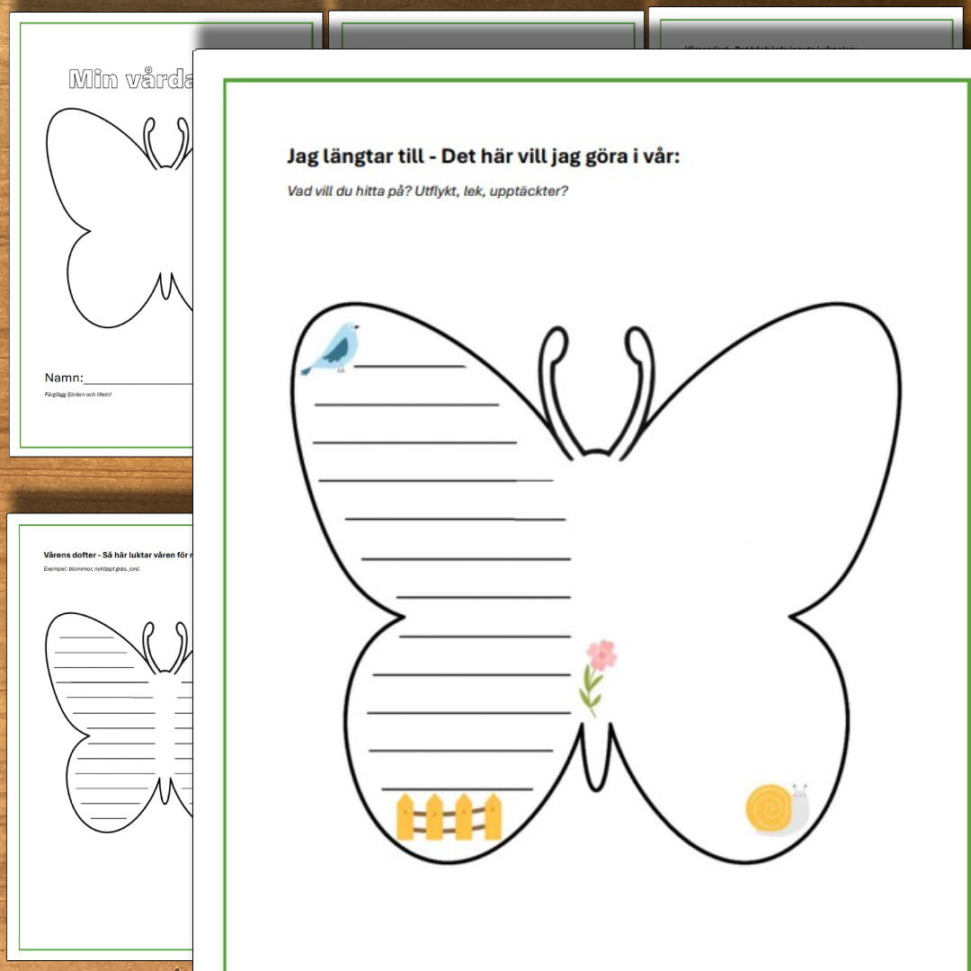 Materialet består av 6 fjärilsformade sidor där eleverna får reflektera över vårens ljud, dofter, minnen och förväntningar. När sidorna är färdiga klipps de ut och sätts ihop till en unik bok – perfekt för klassrumsutställning eller att ta med hem som ett personligt vårminne.