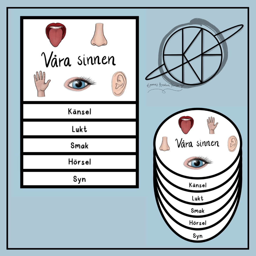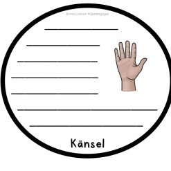 - Varje design har en sida där eleverna får skriva om känsel, lukt, smak, hörsel och syn.