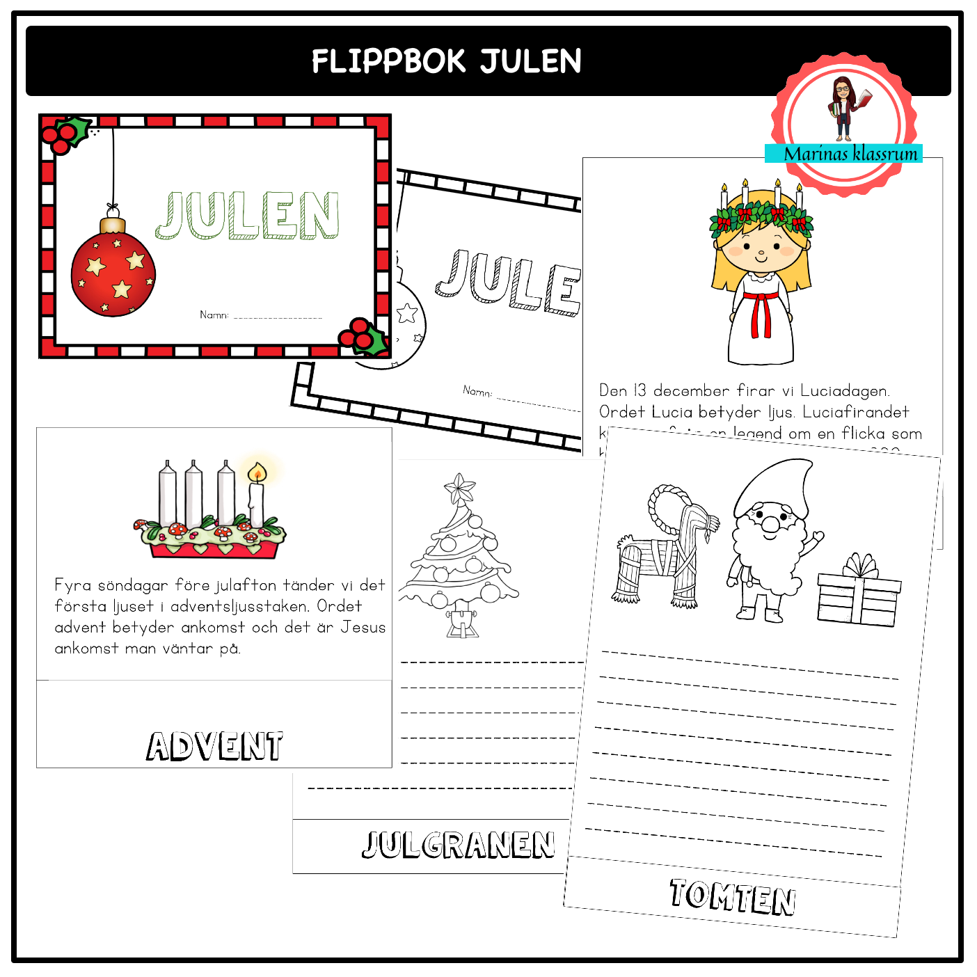 Låt eleverna göra en liten flipp-bok och måla och skriva om julen. Flipp-boken består av 4 olika flikar: advent, Lucia, julgranen och tomten. Materielet är både i färg och svartvitt och innehåller både en exempelbok med förslag till text och en med linjer för eleverna att skriva själva.