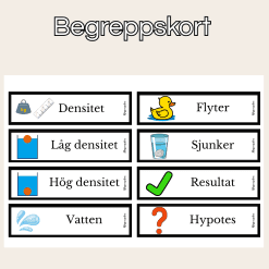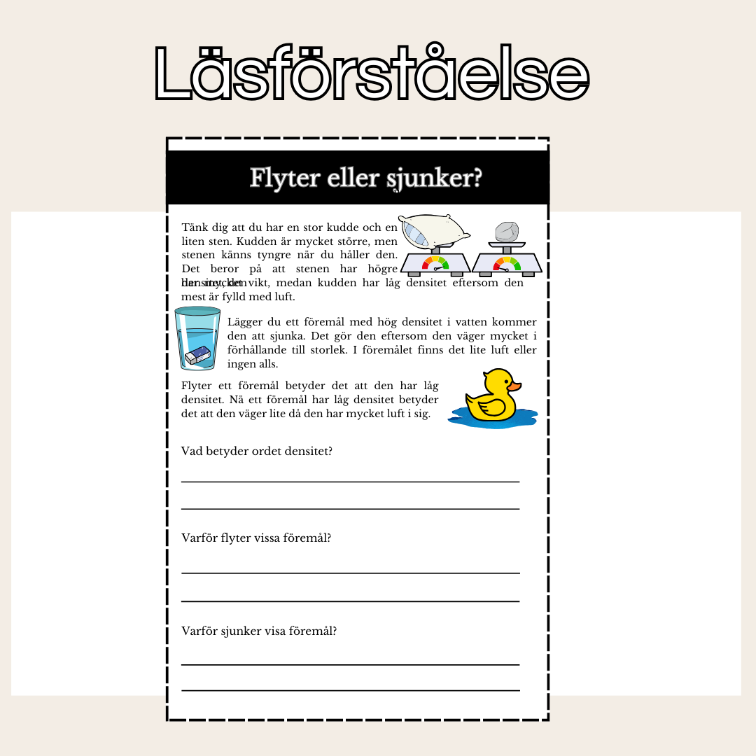 - Läsförståelse där eleverna får bekanta sig med begreppet densitet och vad som gör att ett föremål flyter eller sjunker.