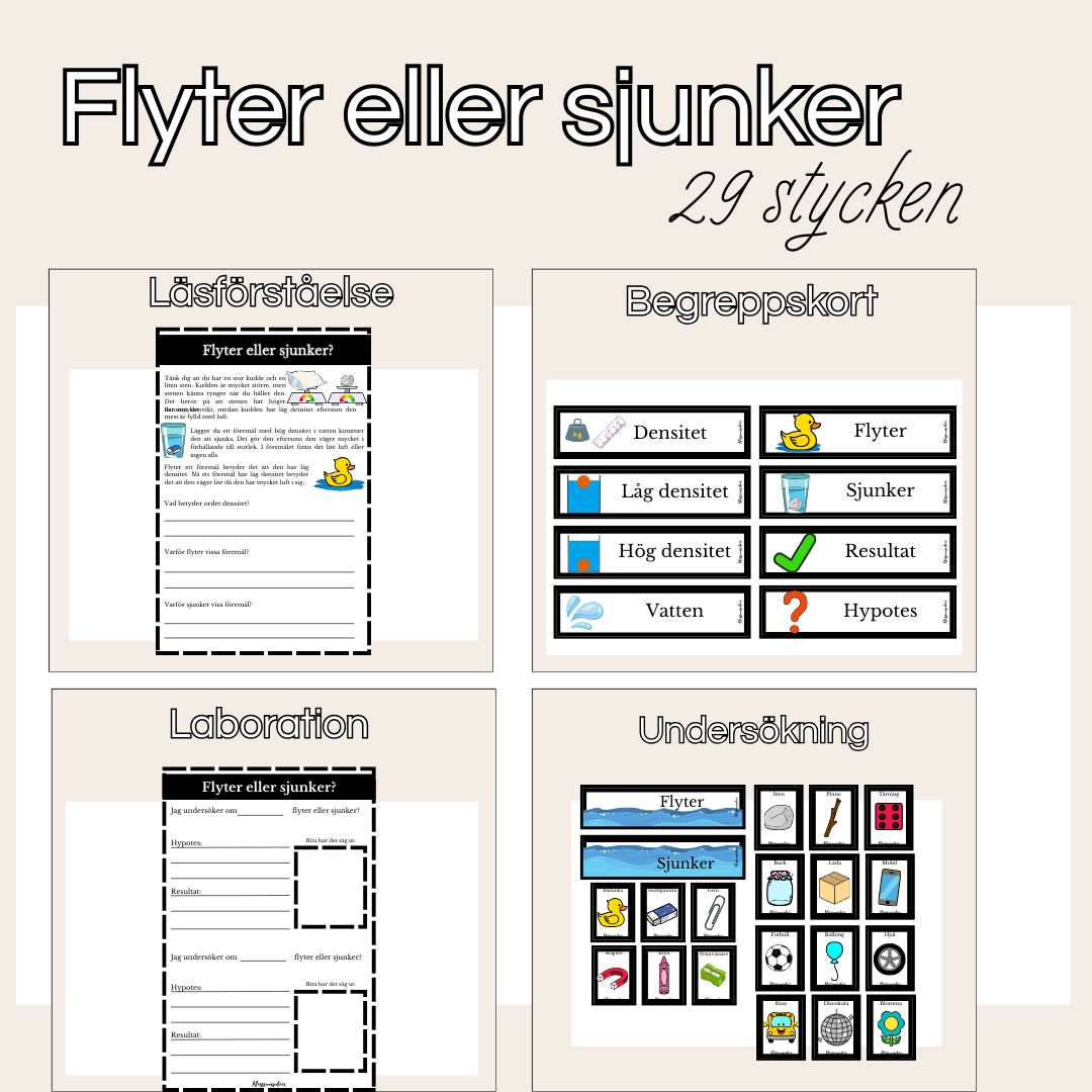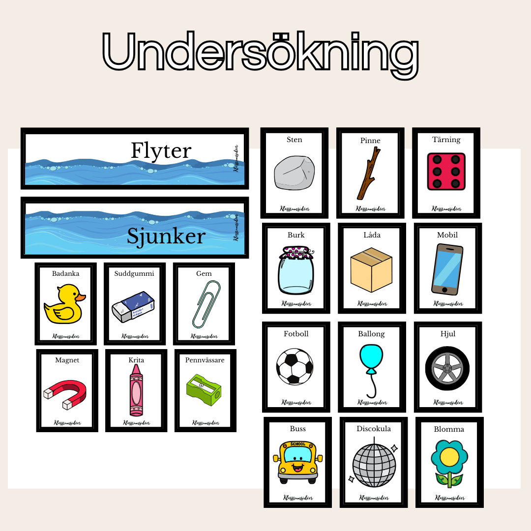 - Bildkort som kan användas för att checka av elevernas förståelse för vad som eventuellt flyter eller sjunker, kan även användas som startuppgift tillsammans