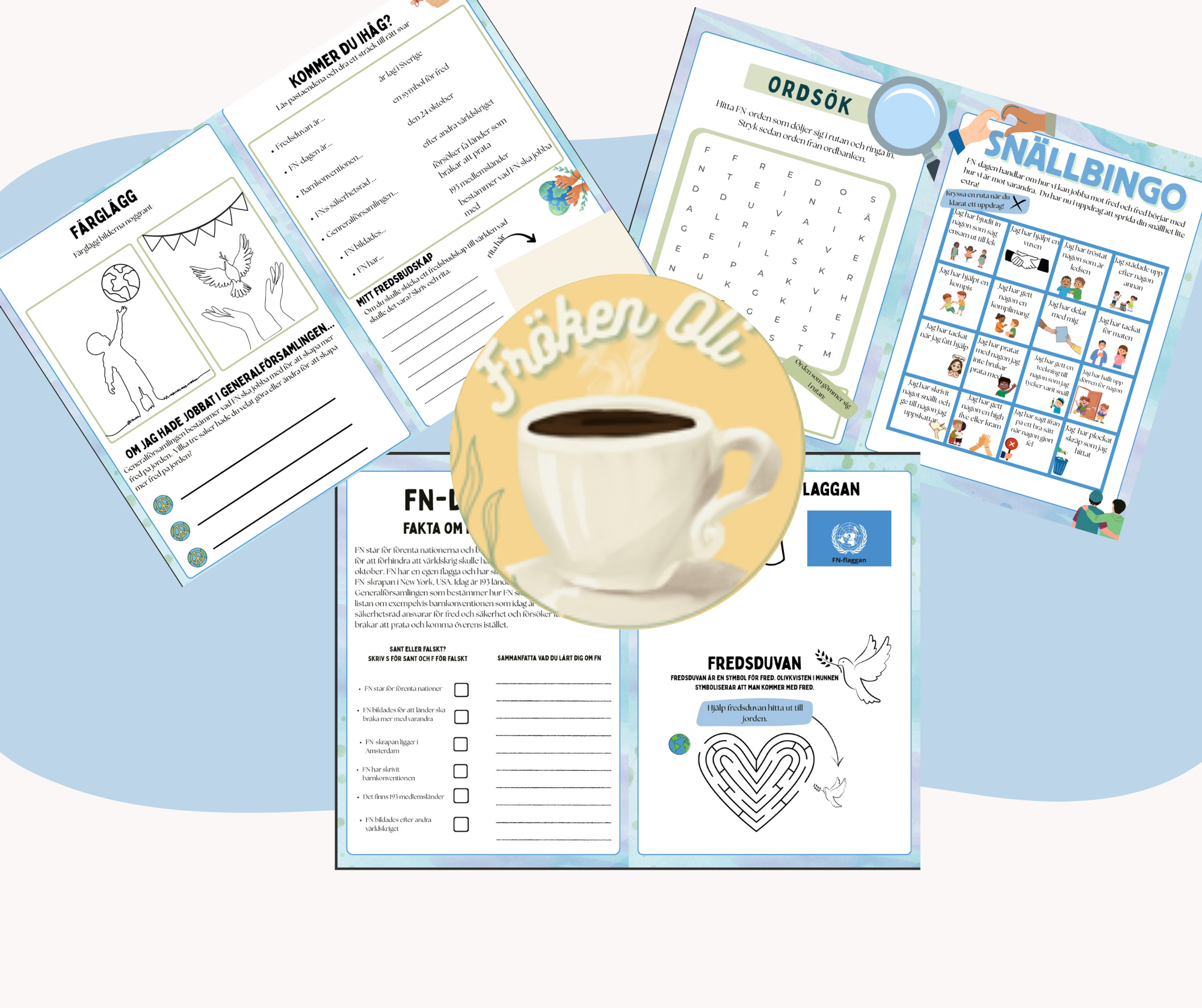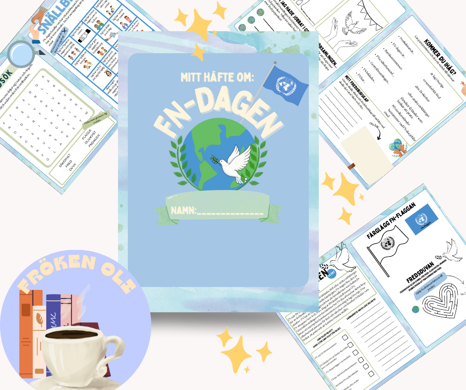 I detta häftet så får eleverna lära sig lite om FN-dagen och svara på sant eller falskt frågor. Det finns även lite roliga uppgifter såsom färgläggning, labyrint, ordsök och snällbingo och allt detta kopplat till FN-dagen.