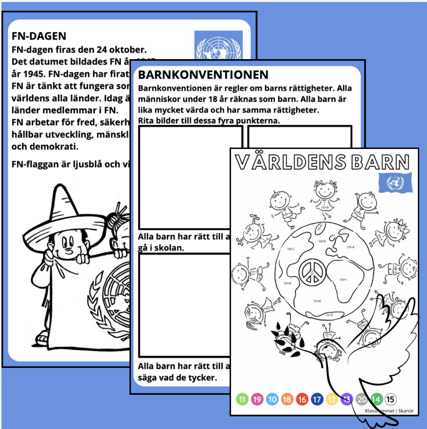 Tre arbetsblad med lättläst fakta om FN och barnkonventionen. Målarbild med FNflagga och fyra punkter från barnkonventionen att rita bilder till samt en räknemåla som tränar 10 +.