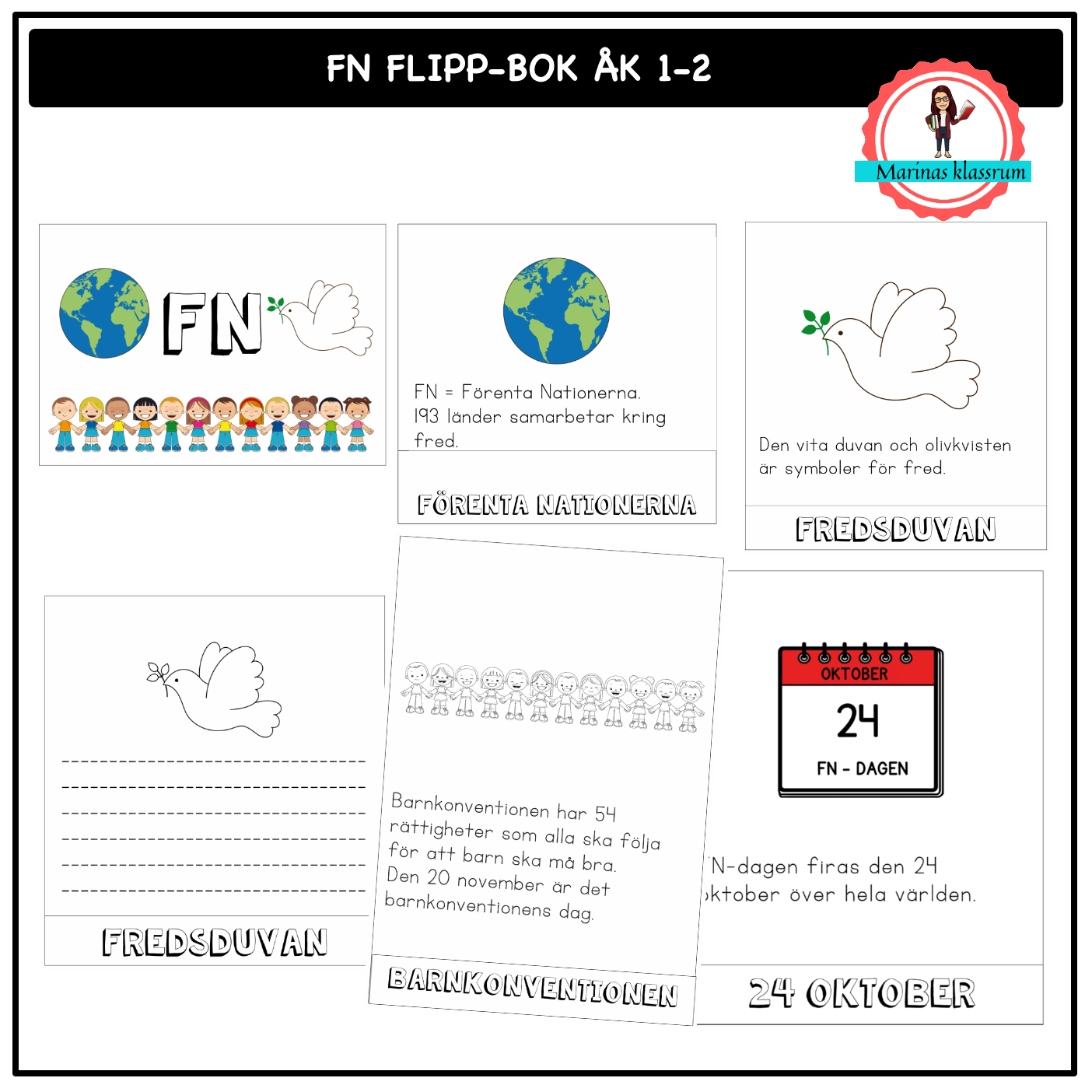 Låt eleverna lära sig om FN och skapa en egen flippbok. Boken består av 4 olika sidor med följande rubriker: Förenta Nationerna, 24 oktober, barnkonventionen och globala mål.