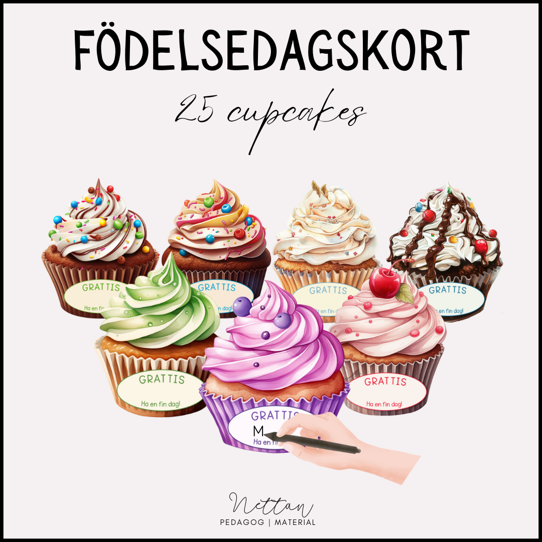 Materialet består av 25 olika cupcakes. Klipp ut och skriv barnens namn och ålder eller födelsedatum. Laminera, klipp ut och sätt upp på avdelningen eller i klassrummet. Skriv ut två sidor på ett ark om du vill ha mindre cupcakes.