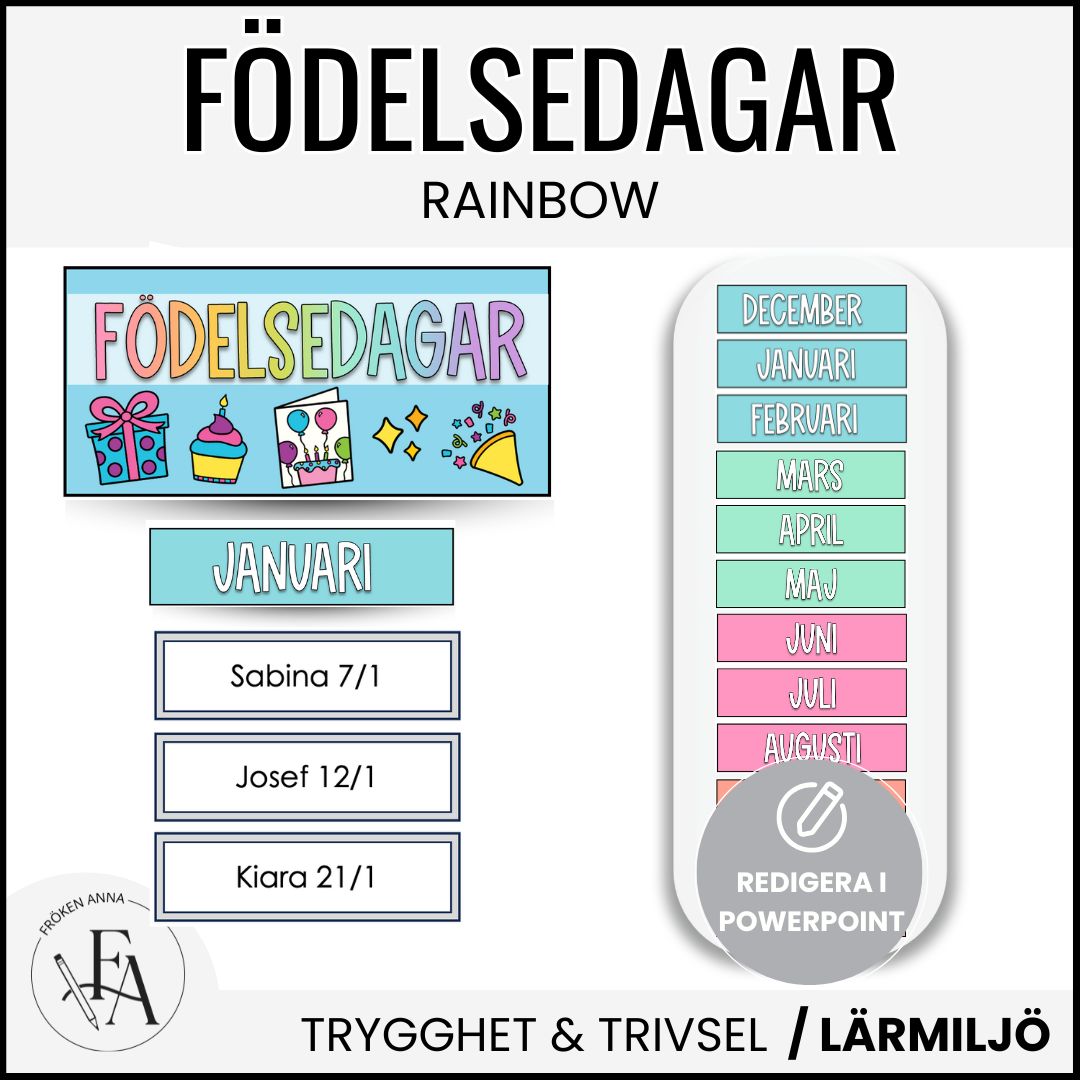 Synliggör elevernas födelsedagar med en färgglad födelsedagsdisplay. Ni kan själva fylla i barnens / elevernas födelsedagar i de redigerbara mallarna i PowerPoint.