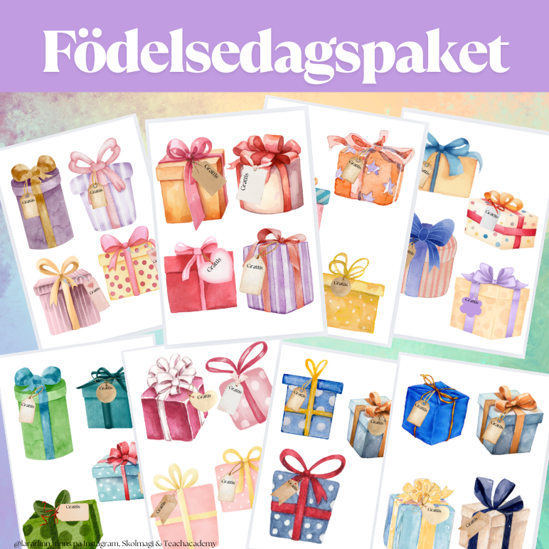 Födelsedagspaketet med etiketter där du kan skriva elevernas namn. Det finns 30 st unika paket i olika färger till varje elev i dokumentet. Paketen sätts upp i klassrummet för att fira varje elev på deras födelsedag. När det är dags att fira, får eleven ta hem sitt födelsedagspaket som ett minne från klassen.