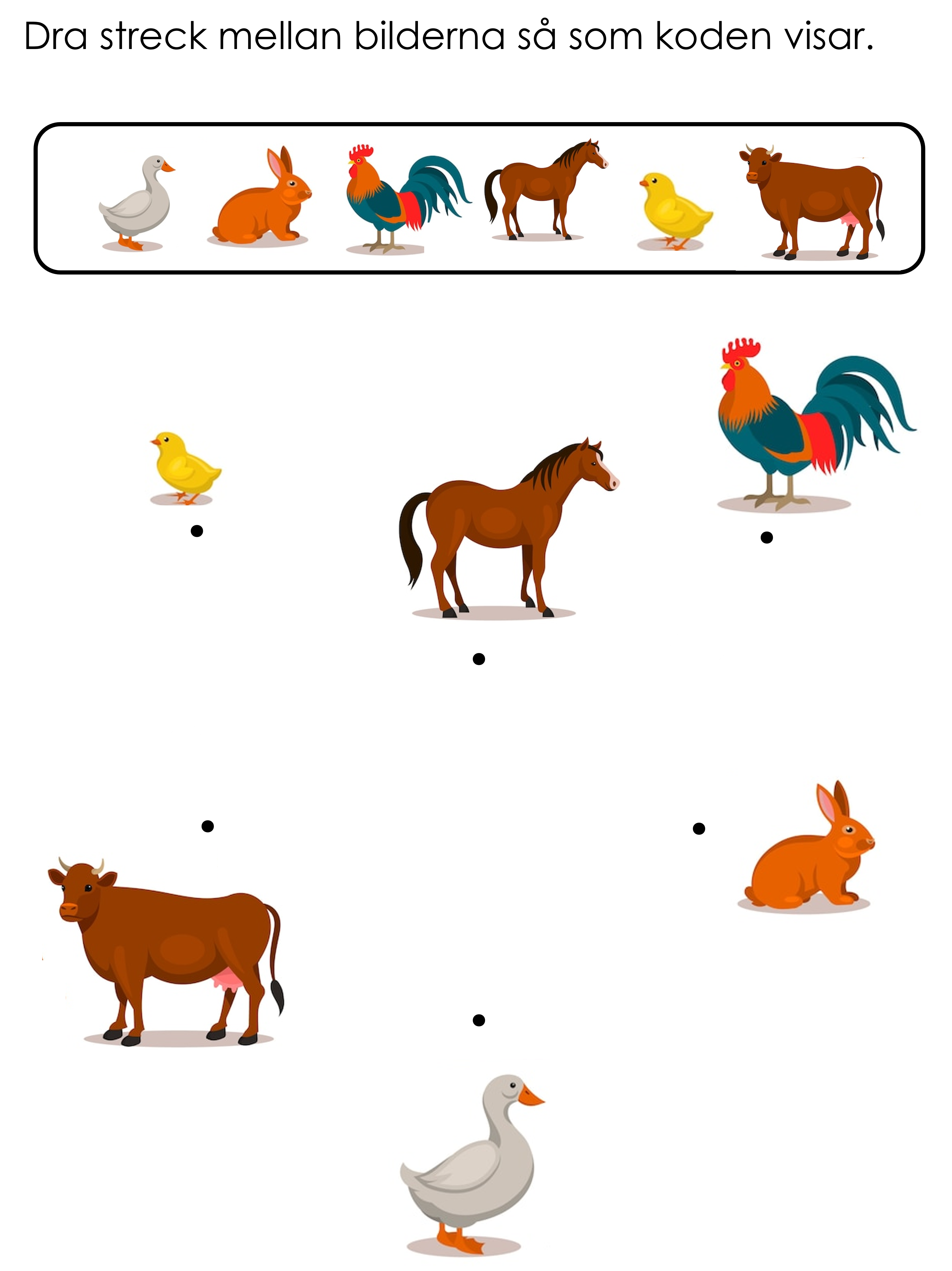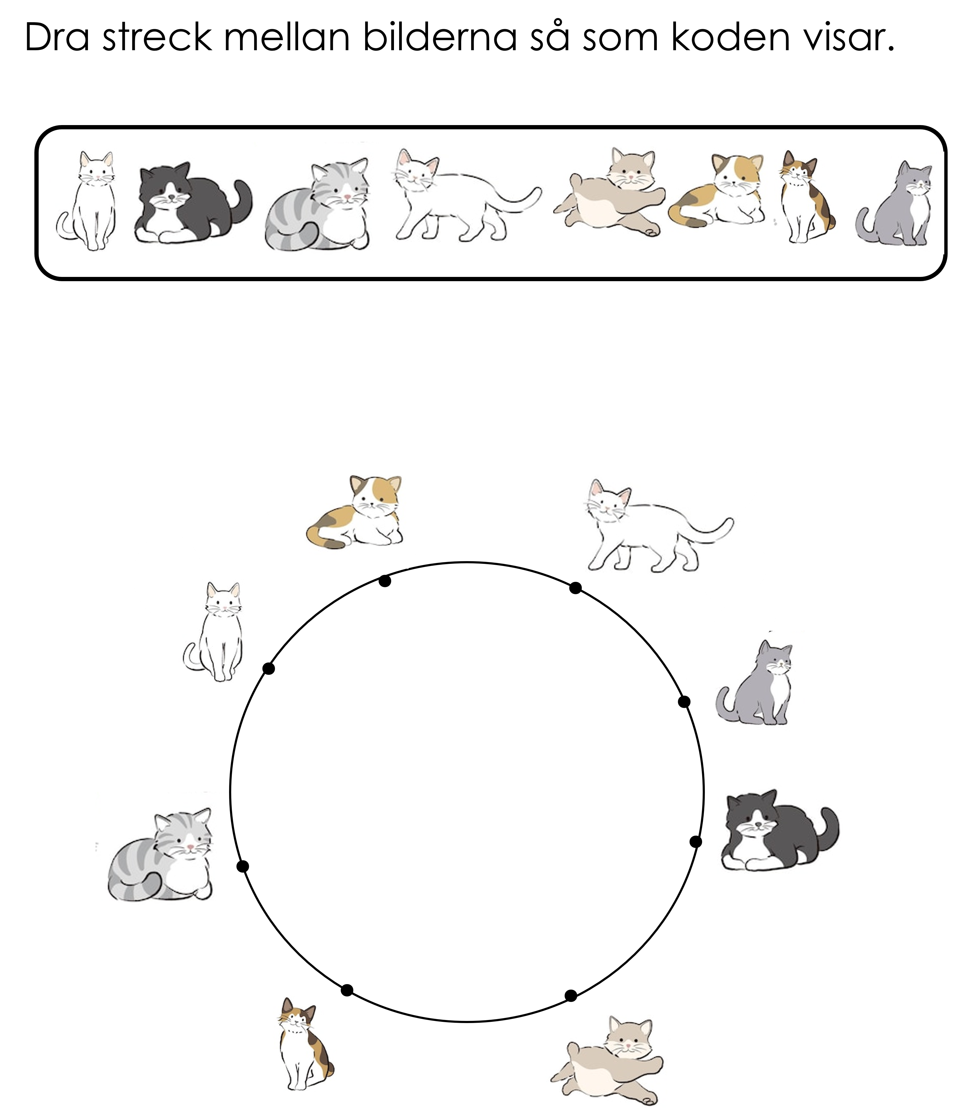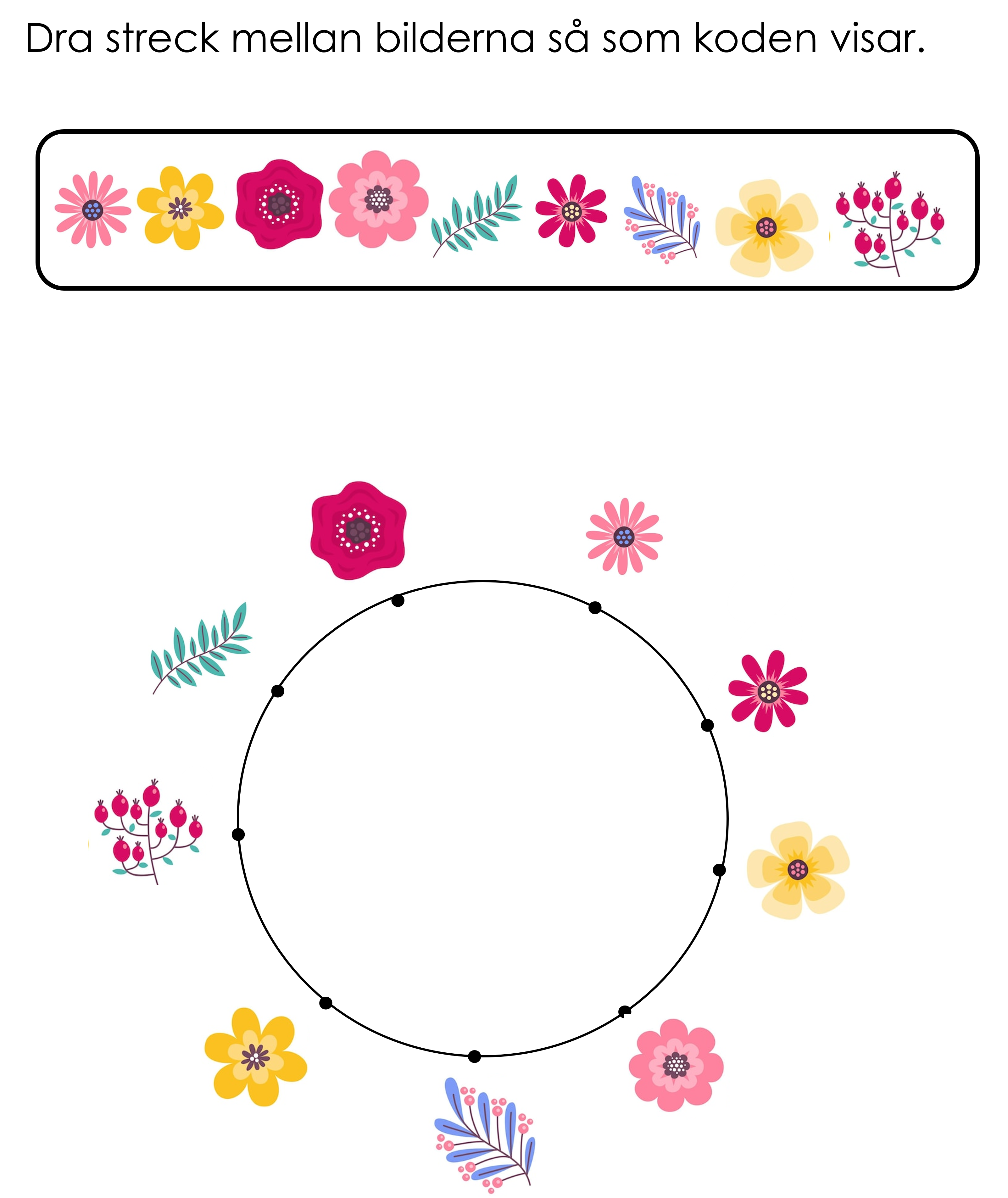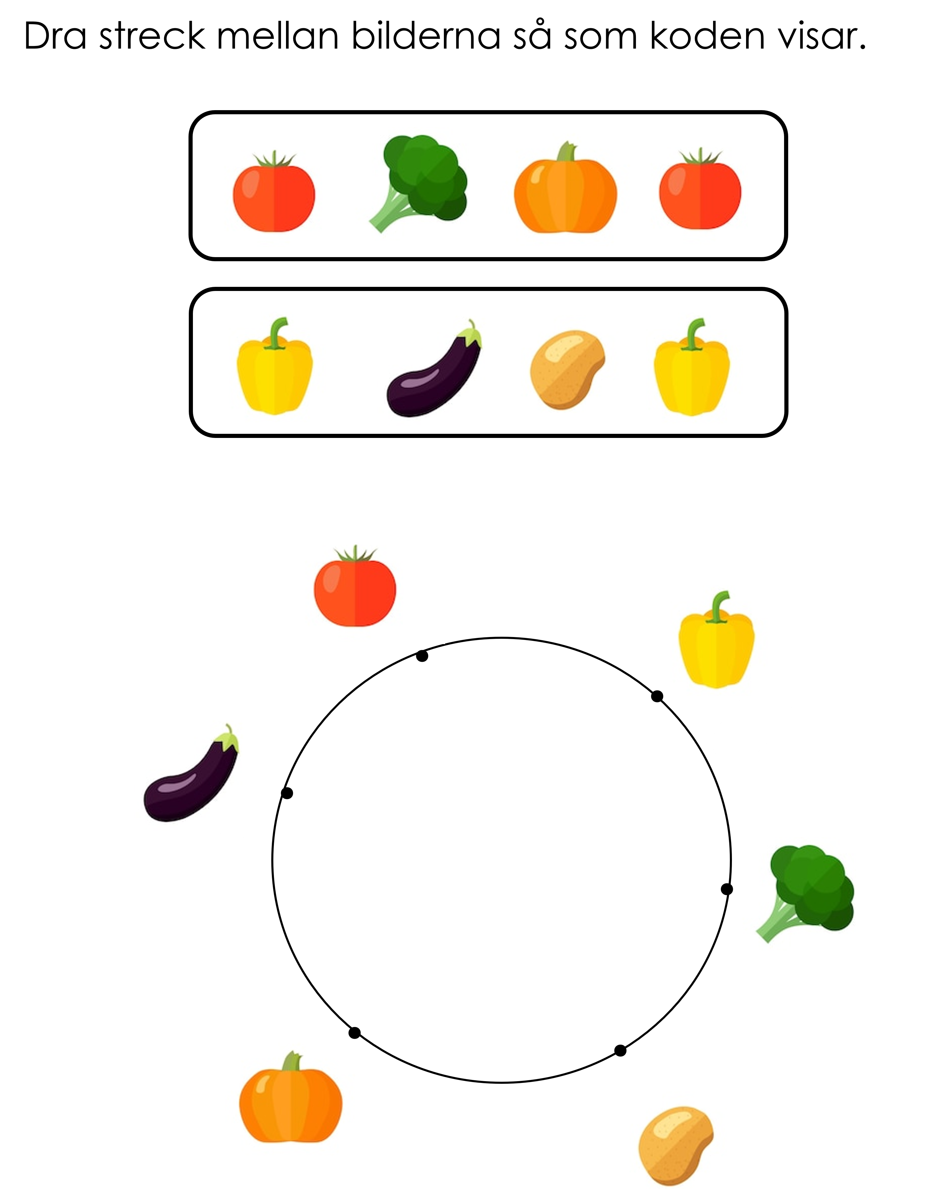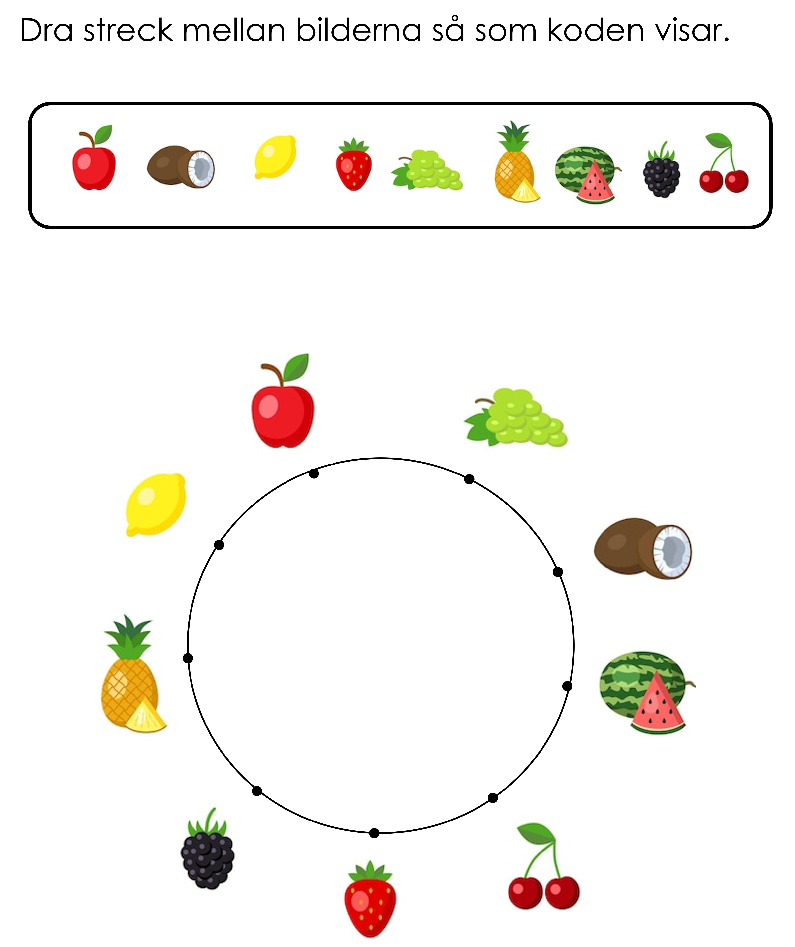 Materialet är ett matematikmaterial där barnet ska följa en kod och dra streck mellan olika figurer.