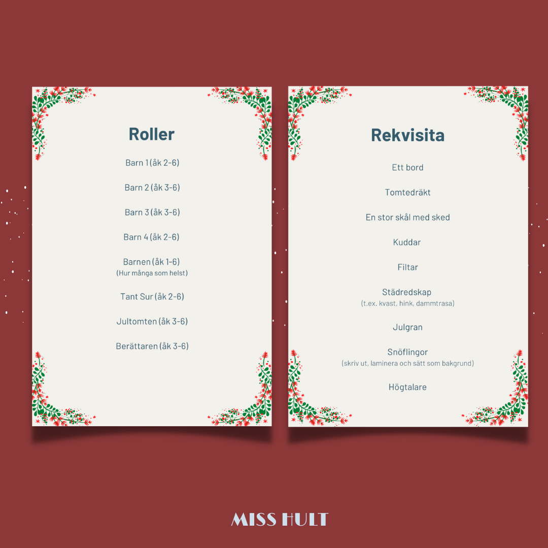 Finns det något bättre sätt att avsluta terminen på än ett mysigt julspel? Föräldralösa barnens julspel är ett julspel för elever från årskurs 1 till 6. Den handlar om hur barnen rymmer från barnhemmet mitt i natten från den onda tanten. Barnen går vilse och kommer fram till Tomtens hus. Det slutar med att de föräldralösa barnen blir Tomtens tomtenissar. Det finns många olika roller i pjäsen, vilket gör att alla kan vara med, den blyga som inte vill göra så mycket till den som vill ta mycket plats och ha repliker. Det är en julpjäs med ett färdigt manus där det ingår både lite dans och sång, och det behövs inte så mycket rekvisita. Däremot ska övandet börjas i tid så eleverna får de bästa förutsättningarna för att lyckas (ca 3-4 veckor).
