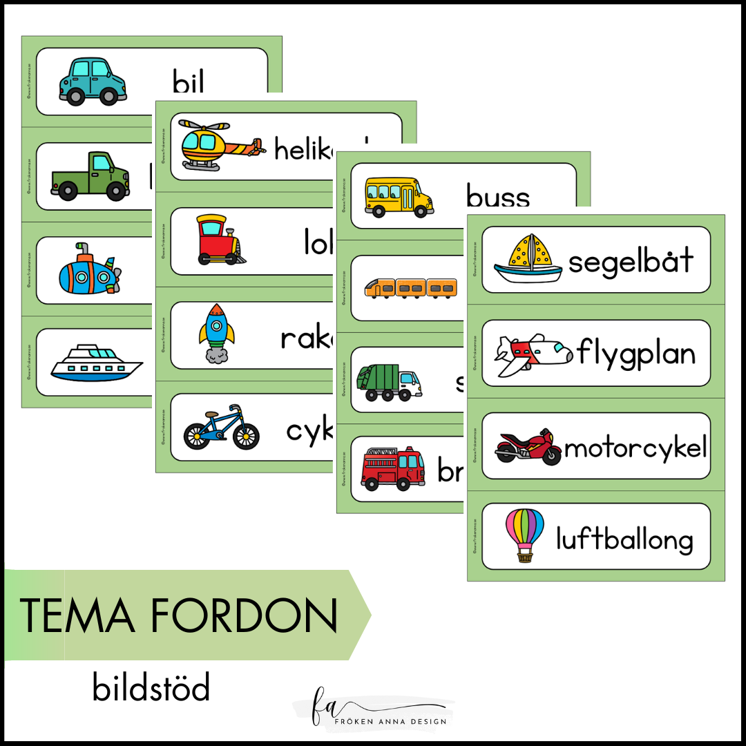 - 20 ordkort med bildstöd, var och ett med ett unikt fordon