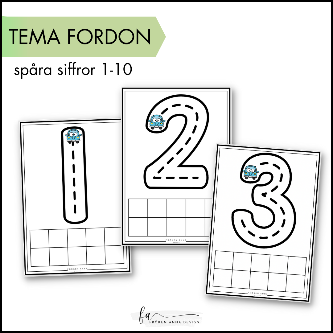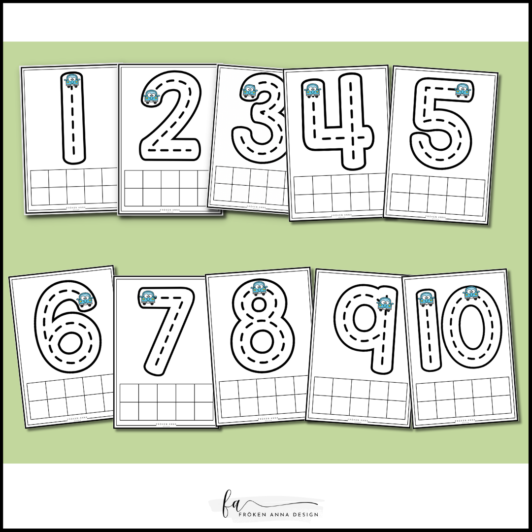 Dessaa pedagogiska blad kombinerar spårövningar med siffror och en räknedel som hjälper barnen att både lära sig siffrornas form och utveckla antalsuppfattning. Varje blad har en stor, tydlig siffra som barnet kan spåra med hjälp av en liten bil som följer siffrans konturer, vilket gör inlärningen både interaktiv och rolig.