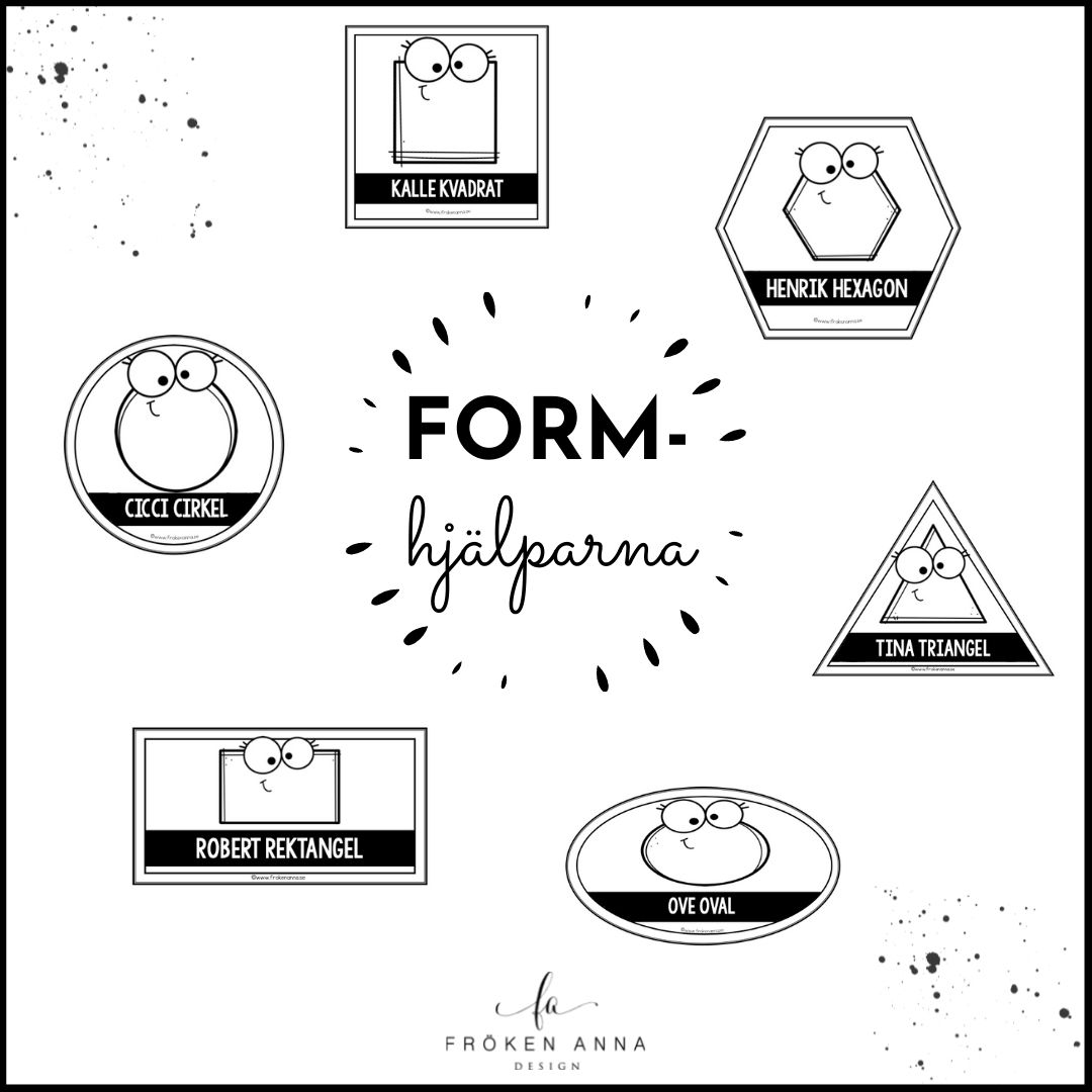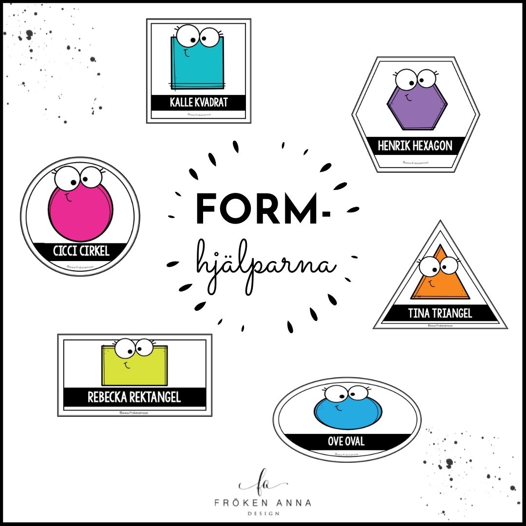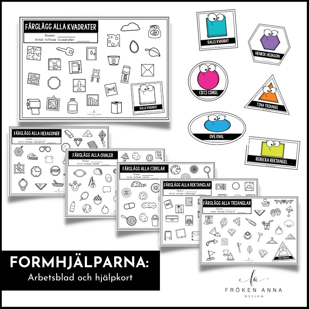 LÀr om geometriska former på ett lustfyllt sÀtt med formhjÀlparna! I detta paket ingår 6 olika hjÀlpkort att klippa ut och laminera (i fÀrg och svartvitt) samt 6 arbetsblad. AnvÀnd t.ex. de fÀrgglada korten som demonstration och låt eleverna fÀrglÀgga de svartvita och limma fast på t.ex. ett fÀrgglatt papper. NÀr ni arbetat med materialet kan ni med fördel sÀtta upp hjÀlpkorten på tavlan, toalettdörren eller annan strategisk plats så eleverna befÀster namnen.