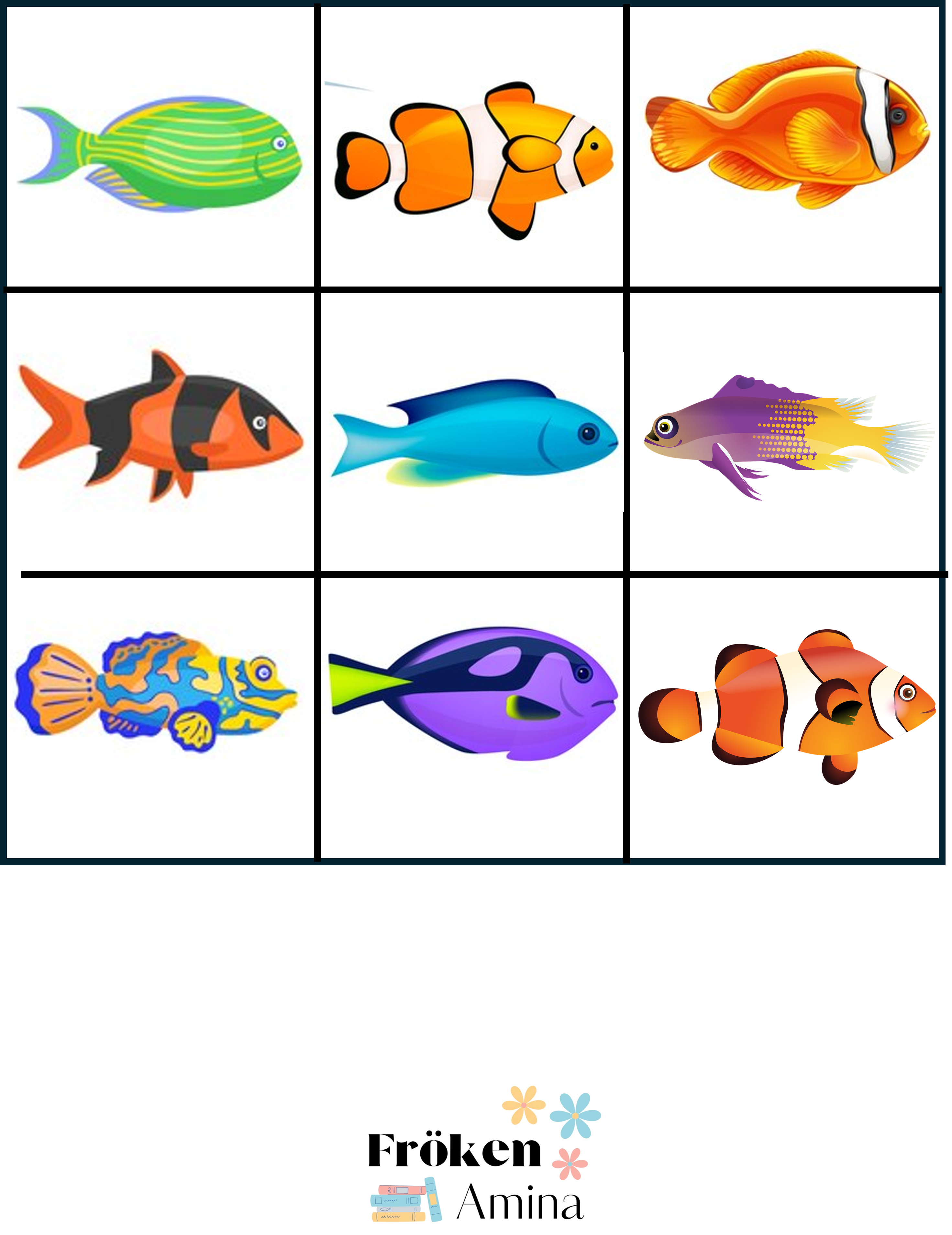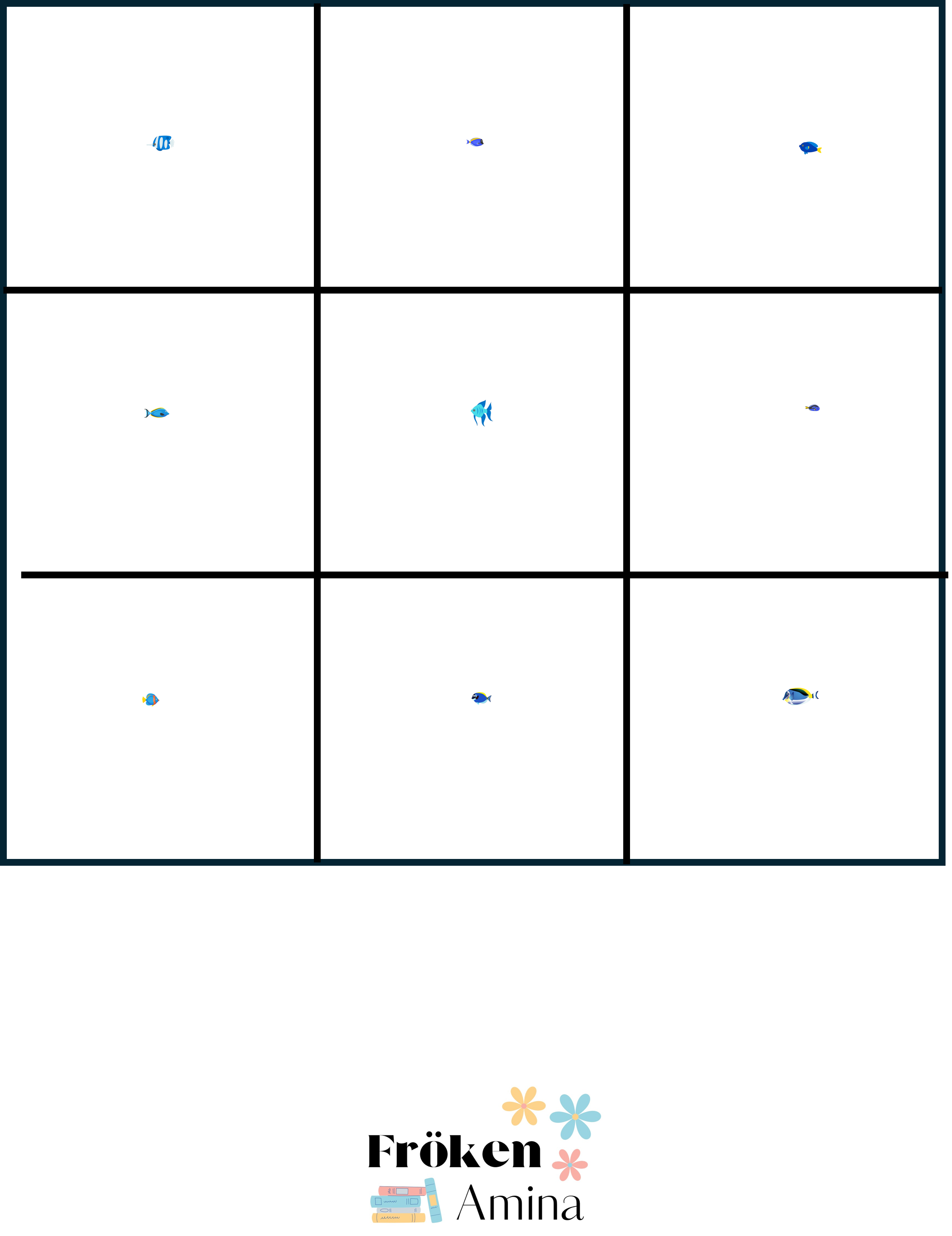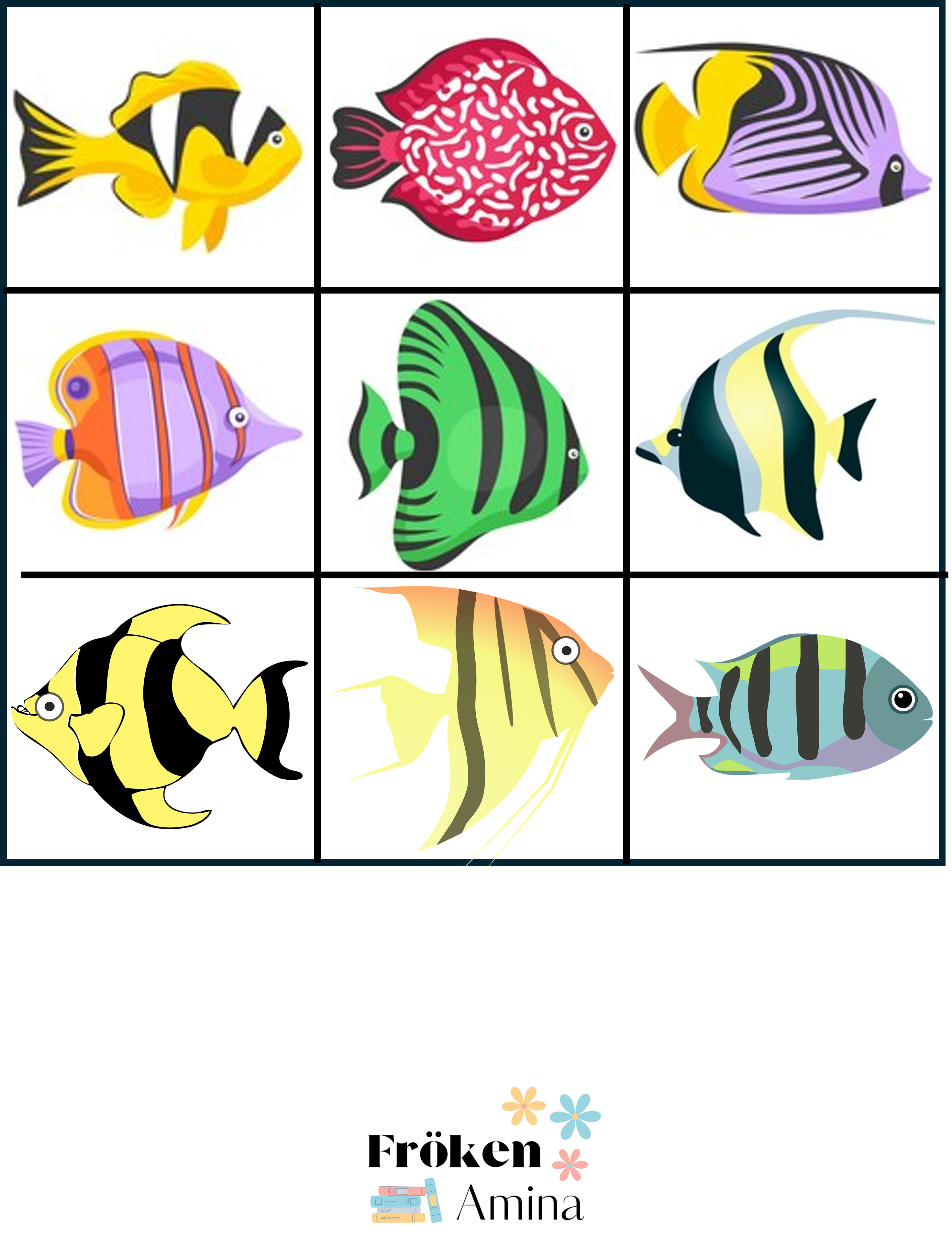 Materialet innehåller 4 stora brickor och 36 kort med små fiskbilder.