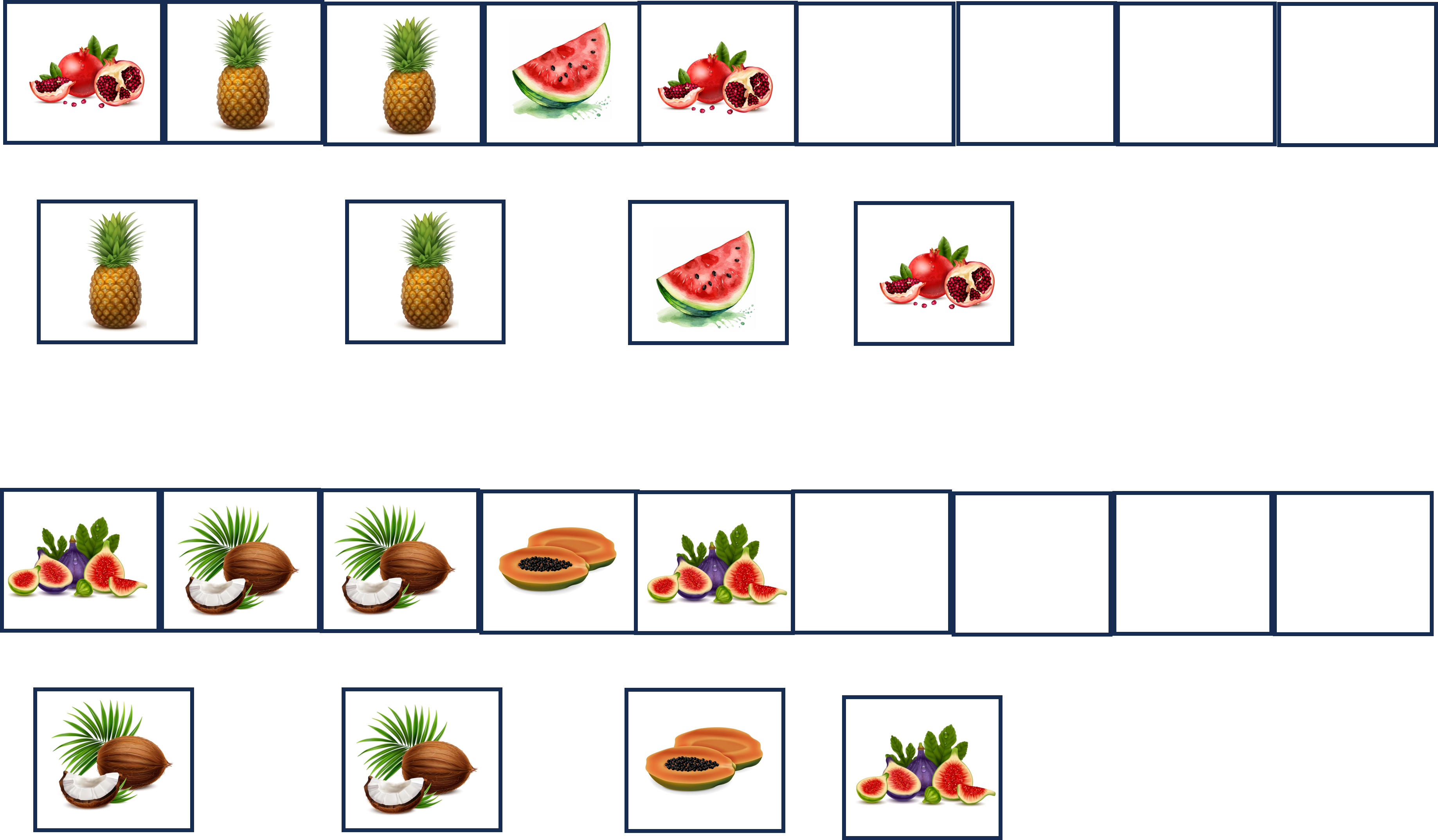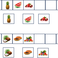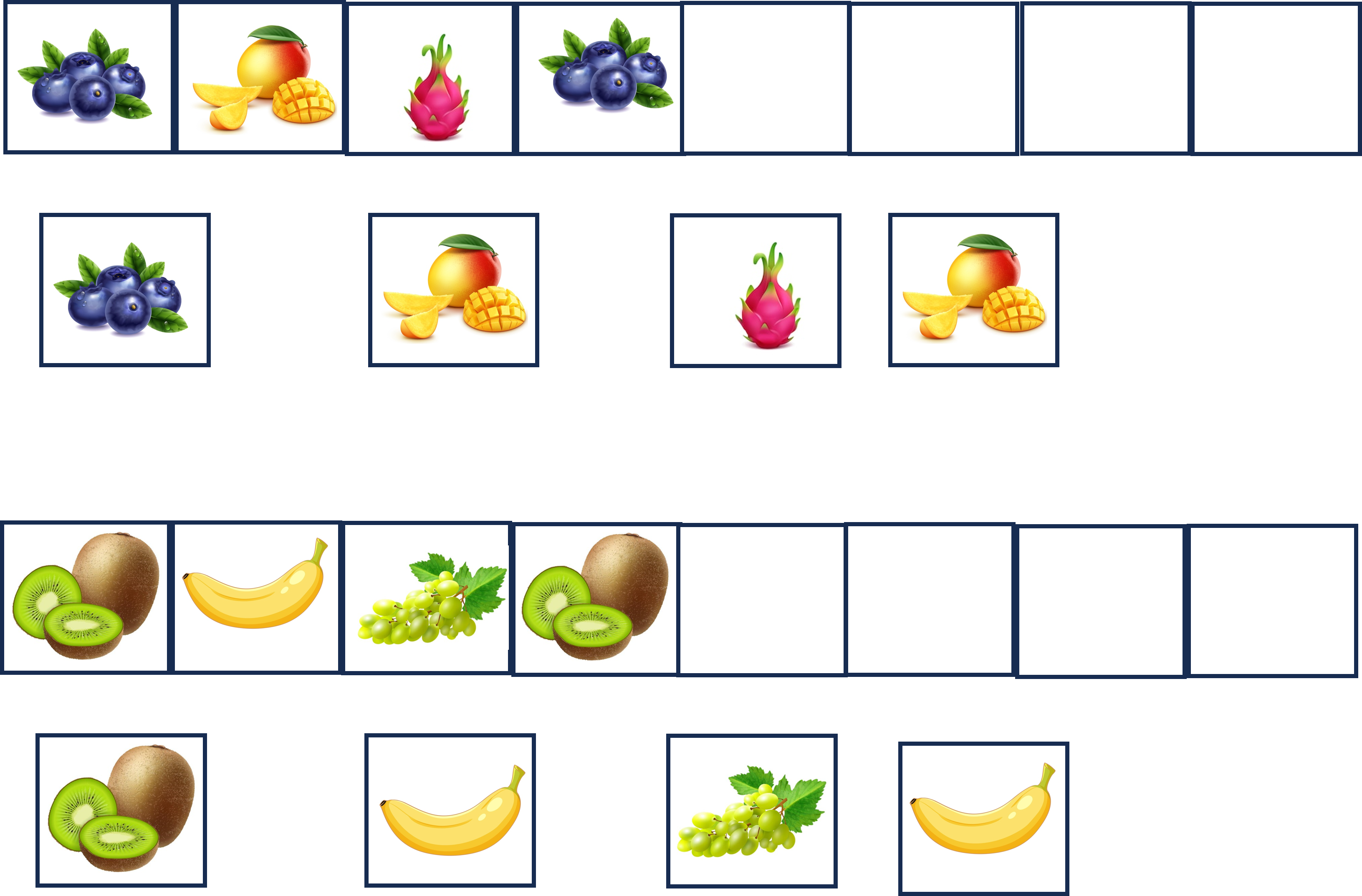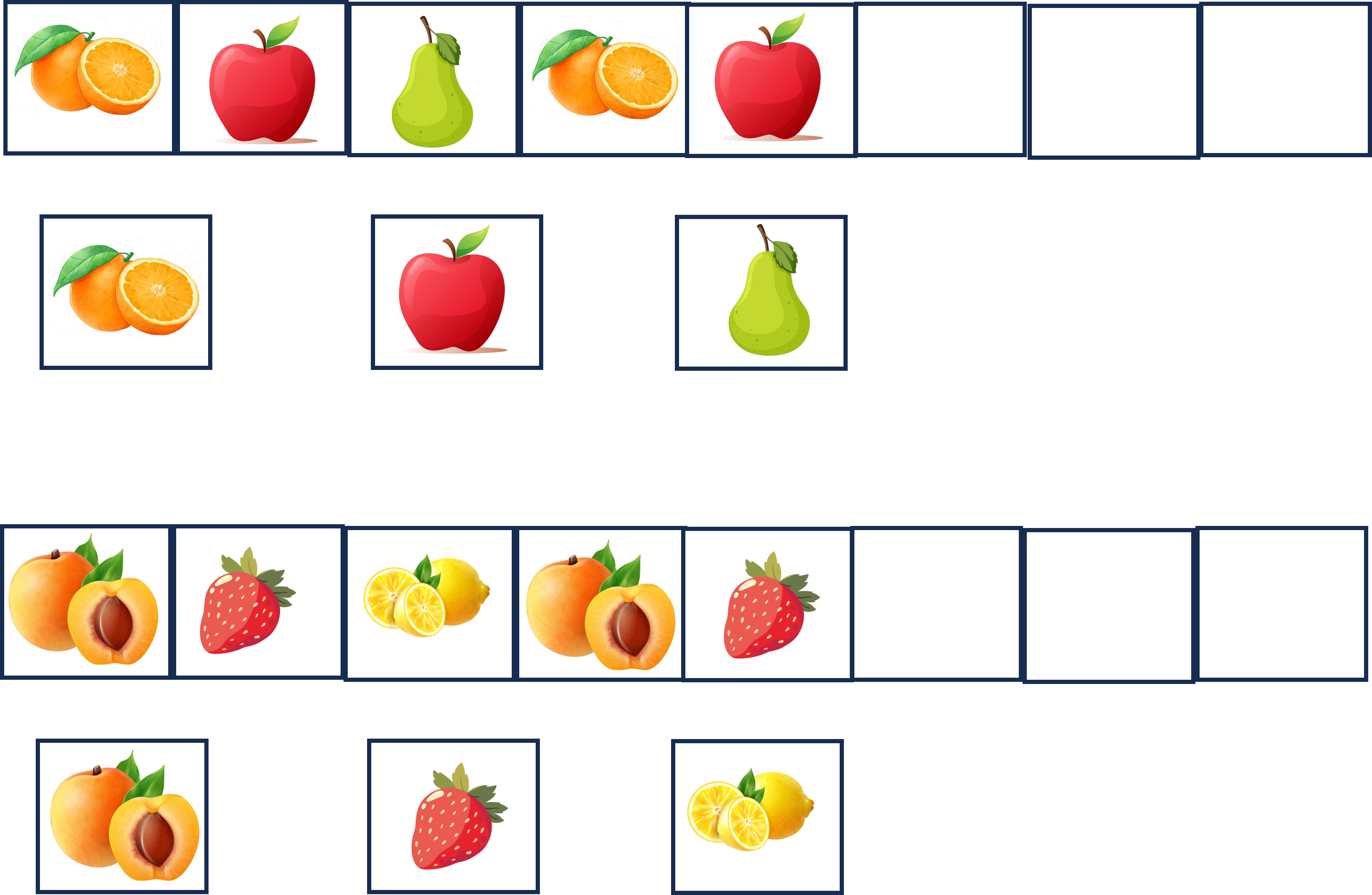 I materialet finns mönsterremsor och små fruktkort. Barnet ska se mönstretpå remsorna och sedan fortsätta mönstret med de små fruktkorten. Laminera materialet så kan man använda materialet om och om igen.