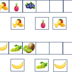 Materialet tränar barnet att se mönster och att fortsätta ett mönster. Temat här är frukter.