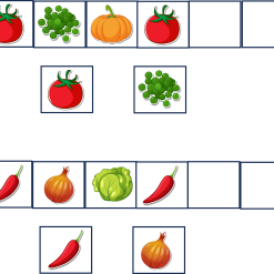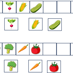 Materialet tränar barnet att se mönster och att fortsätta ett mönster. Temat här är grönsaker.