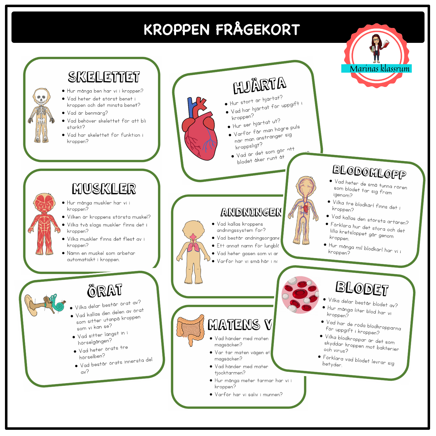 Frågekort som passar till texterna i materialet ”kroppen – faktablad”. Eleverna kan svara på frågorna i en valfri skrivbok eller använda materialet ”Min bok om kroppen – skriv själv”, som består av samma rubriker och bilder med linjer att skriva på.