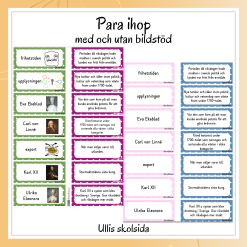 Det är de kooperativa strukturerna Hör vi ihop (går också att använda till para ihop) och Fråga, fråga byt. Här är finns det två varianter, en med bildstöd och en utan bildstöd. Sedan innehåller materialet även två olika ordsök, också de finns både med och utan bilder samt en plansch/struktur med bildstöd som är bra att ha sitta uppe när man jobbar med området.