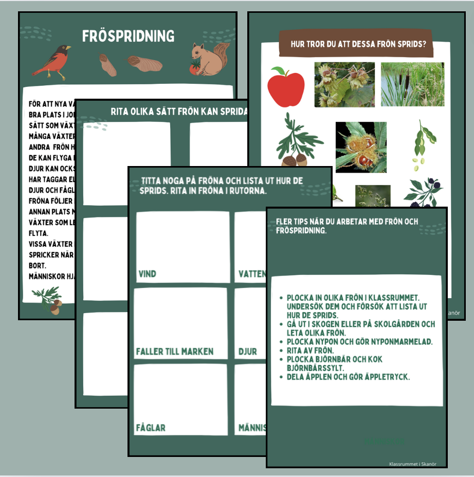 Fröspridning. En enkel faktatext om fröspridning. Arbetsblad att sortera in olika frön i och rita hur frön kan spridas. Tips på hur man kan arbeta med frön.