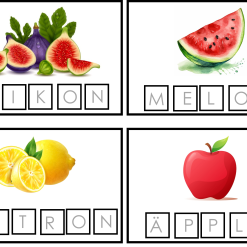 Materialet innehåller 12 kort med stavning, 12 kort utan stavningen och små bokstavskort.