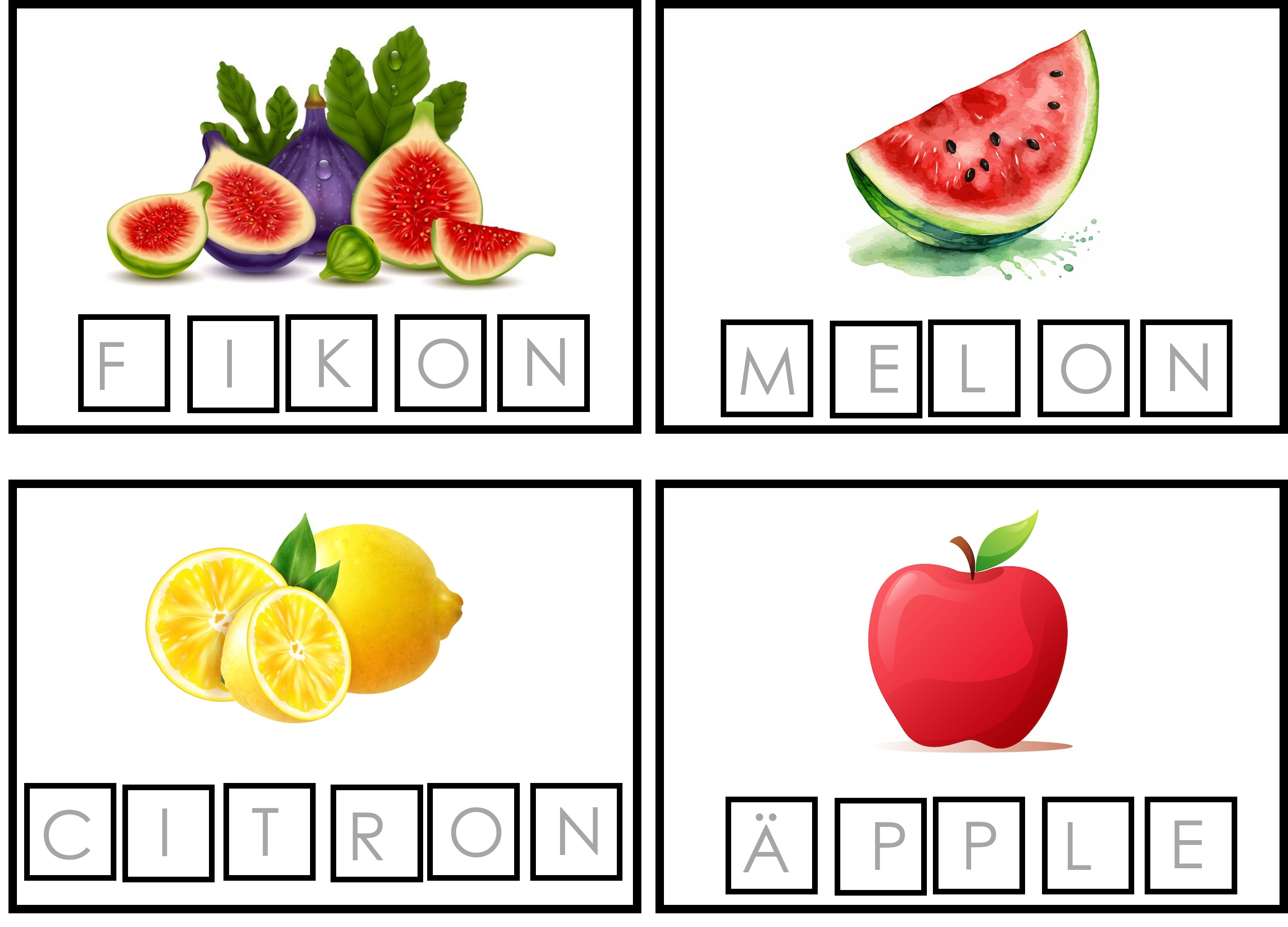 I materialet finns kort där stavningen finns med, de kan man använda för yngre barn eller till barnen har fått in stavningen lite. Då ska de hitta rätt bokstavskort och lägga på bokstaven.