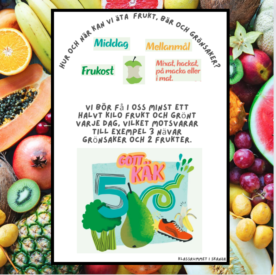 Under vår hälsodag arbetar vi med 5 om dagen – frukt och grönt. Vi pratar om och arbetar med frukt och grönsaker. Tillsammans gör vi en egen smoothie.