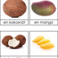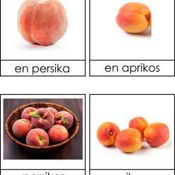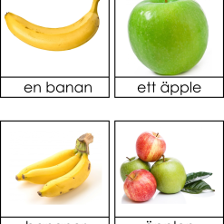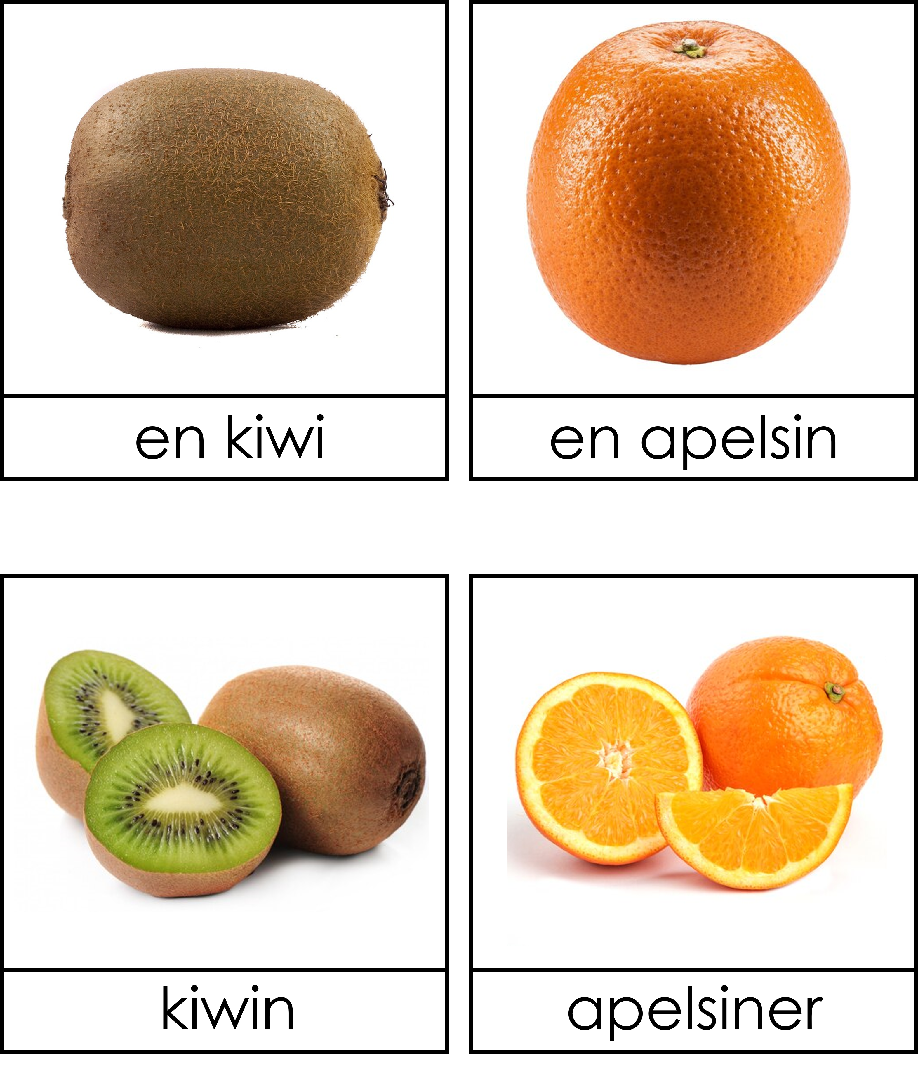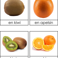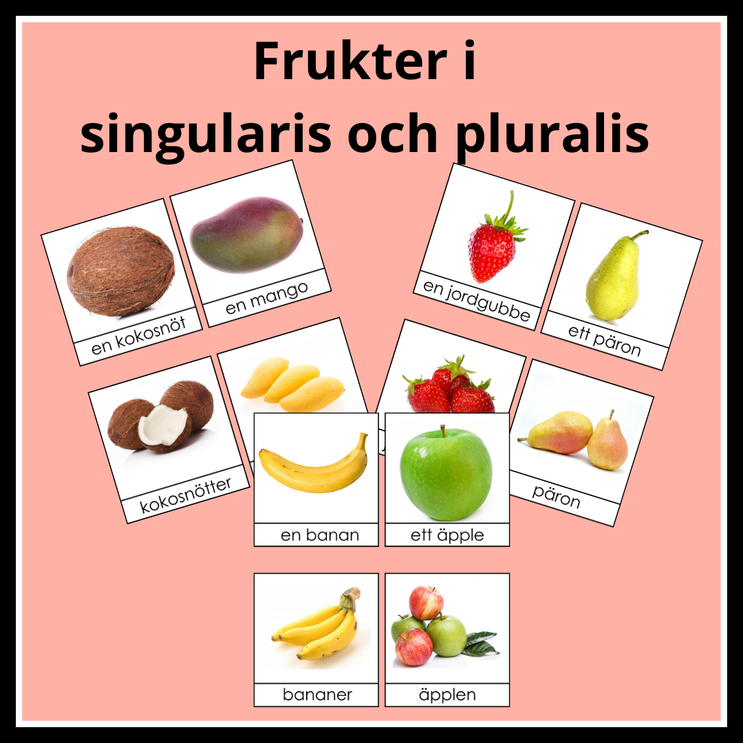 Materialet är ett Montessorimaterial som kallas 3 dels kort. Temat är frukter i singularis och pluralis.