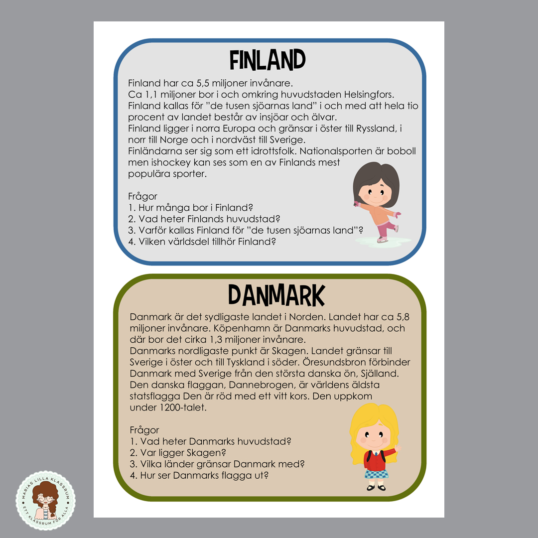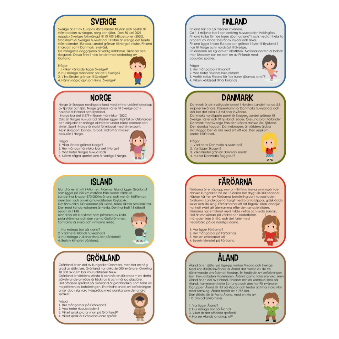Nordens 8 länder -kort att laminera med enkel fakta text och frågor.