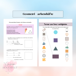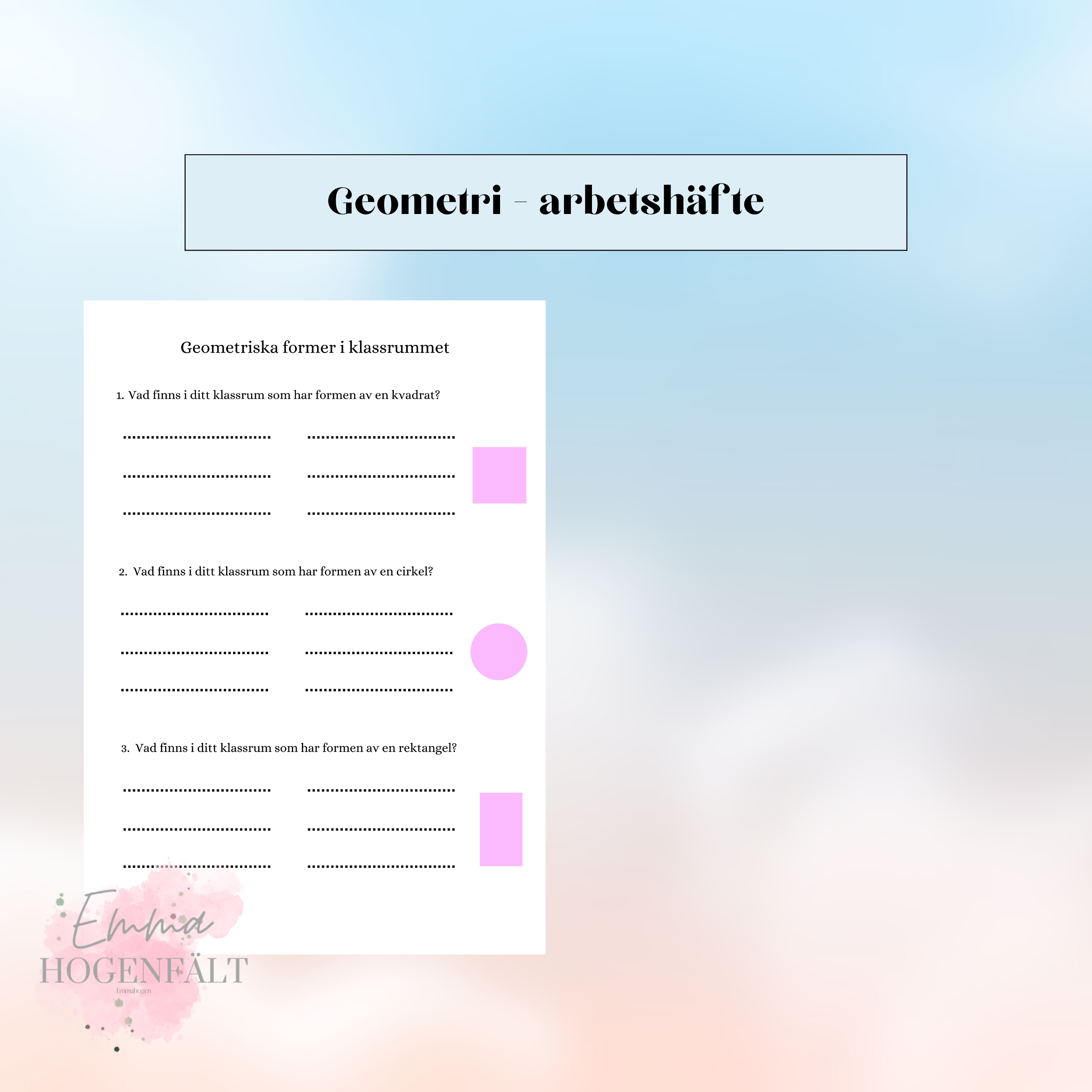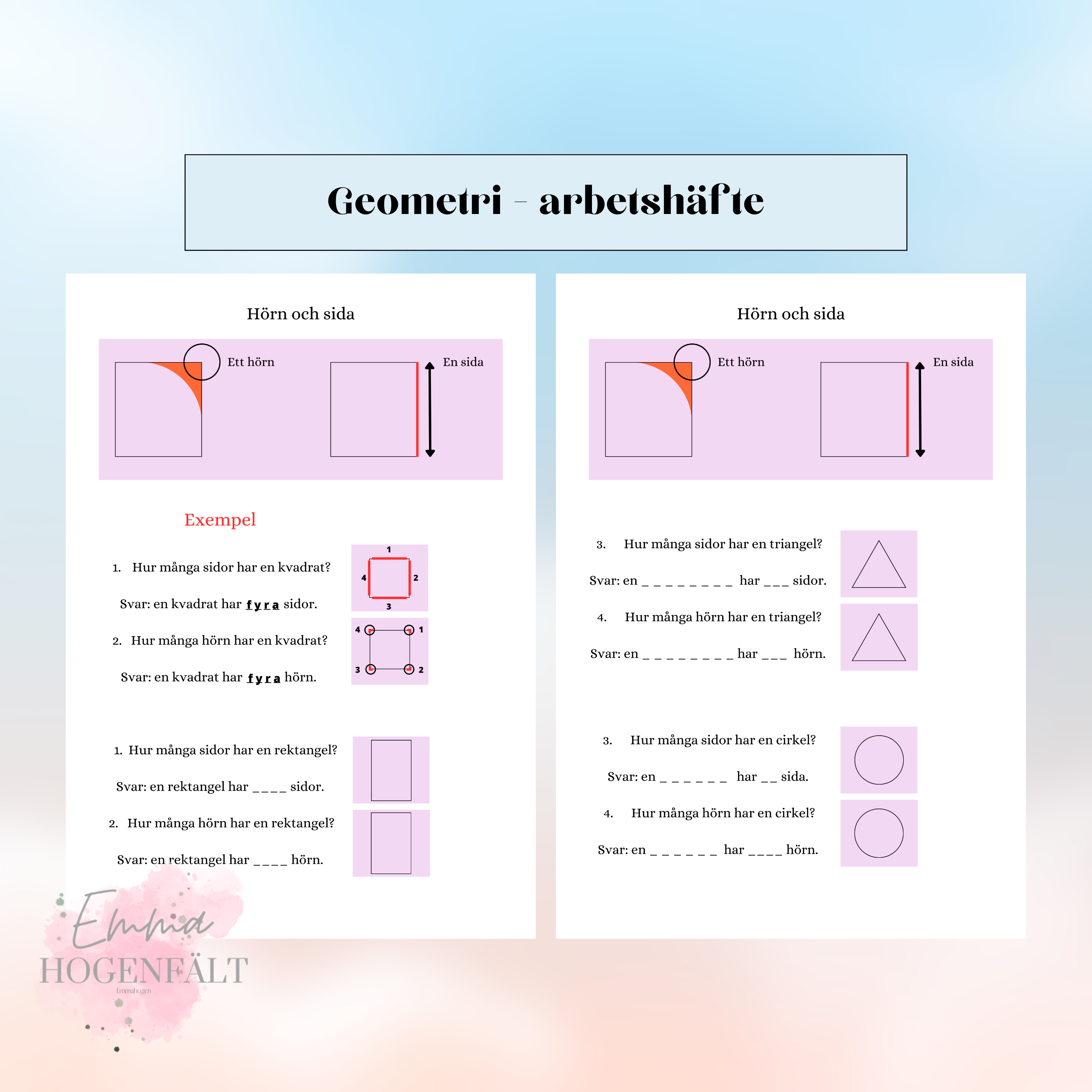 Ett häfte i geometri med bildstöd och exempel för att möjliggöra en självgående uppgift. Häftet består av sju sidor som tränar de geometriska formerna cirkel, kvadrat, rektangel och triangel. Begreppen sida och hörn behandlas också när eleverna ska skriva och ringa in hur många hörn/sidor som olika geometriska former har. Eleverna ska även finna figurerna i klassrummet och dra streck mellan exempelvis en mobiltelefon och en rektangel.
