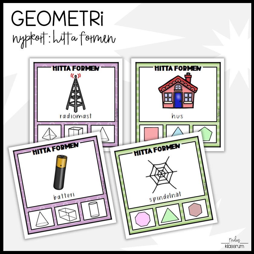 Titta på bilden och matcha med rätt geometrisk form. Materialet innehåller 43 kort med geometriska objekt i 2D och 40 kort med geometriska objekt i 3D.