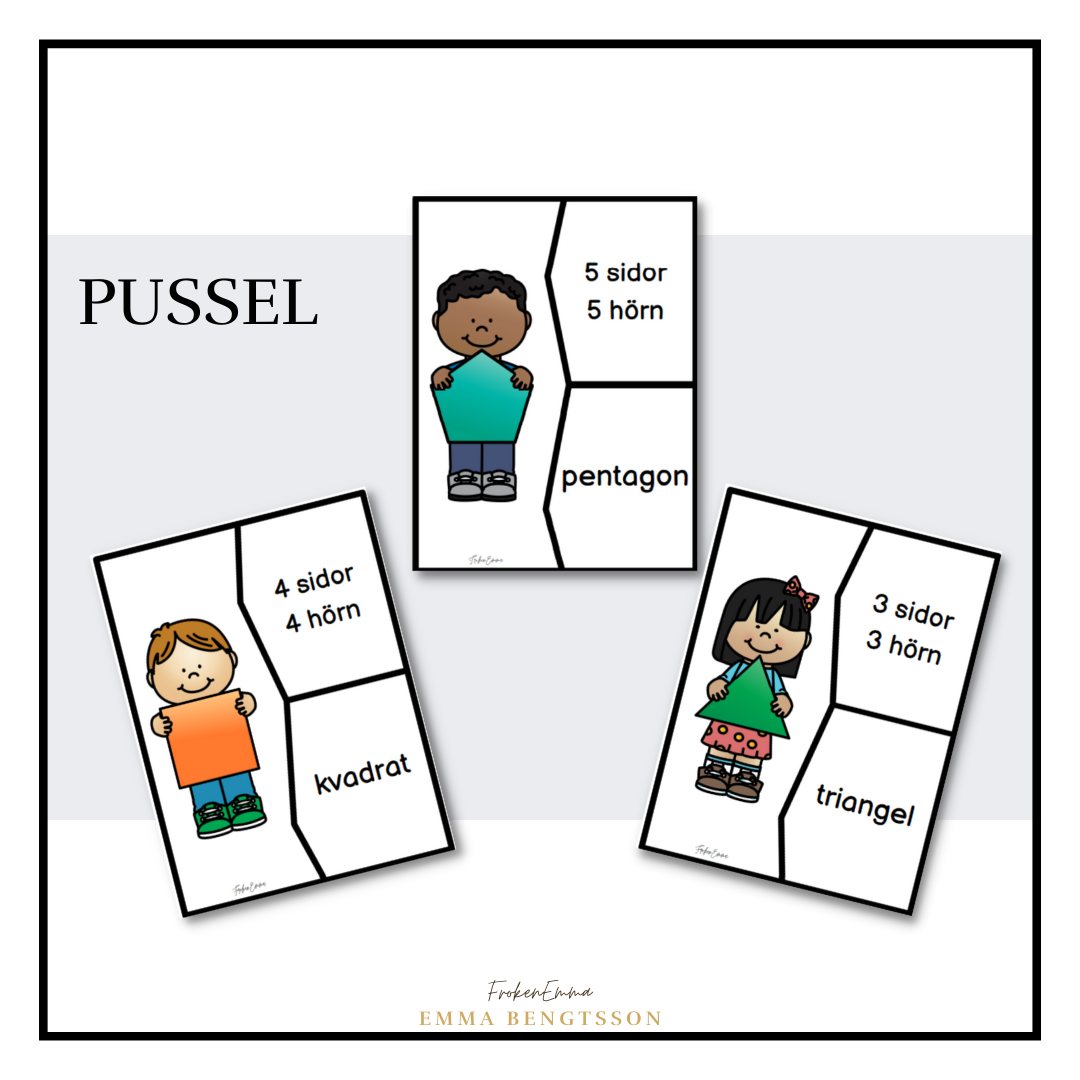 14 olika pussel i tre delar med 2d former. Eleverna ska pussla ihop bild på formen, formens namn och en kort beskrivning av formen.
