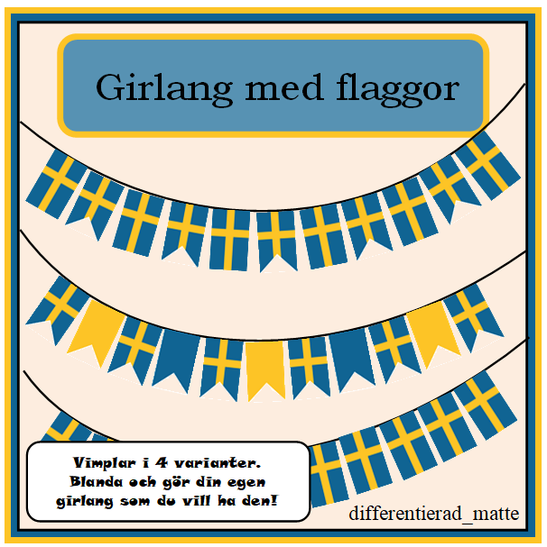 Skapa en girlang med vimplar med svenska flaggan. Vimplarna finns i fyra varianter. Två olika svenska flaggor, en rak svensk flagga och en klippt med snibb. Dessutom finns två enfärgade vimplar, gul och blå.