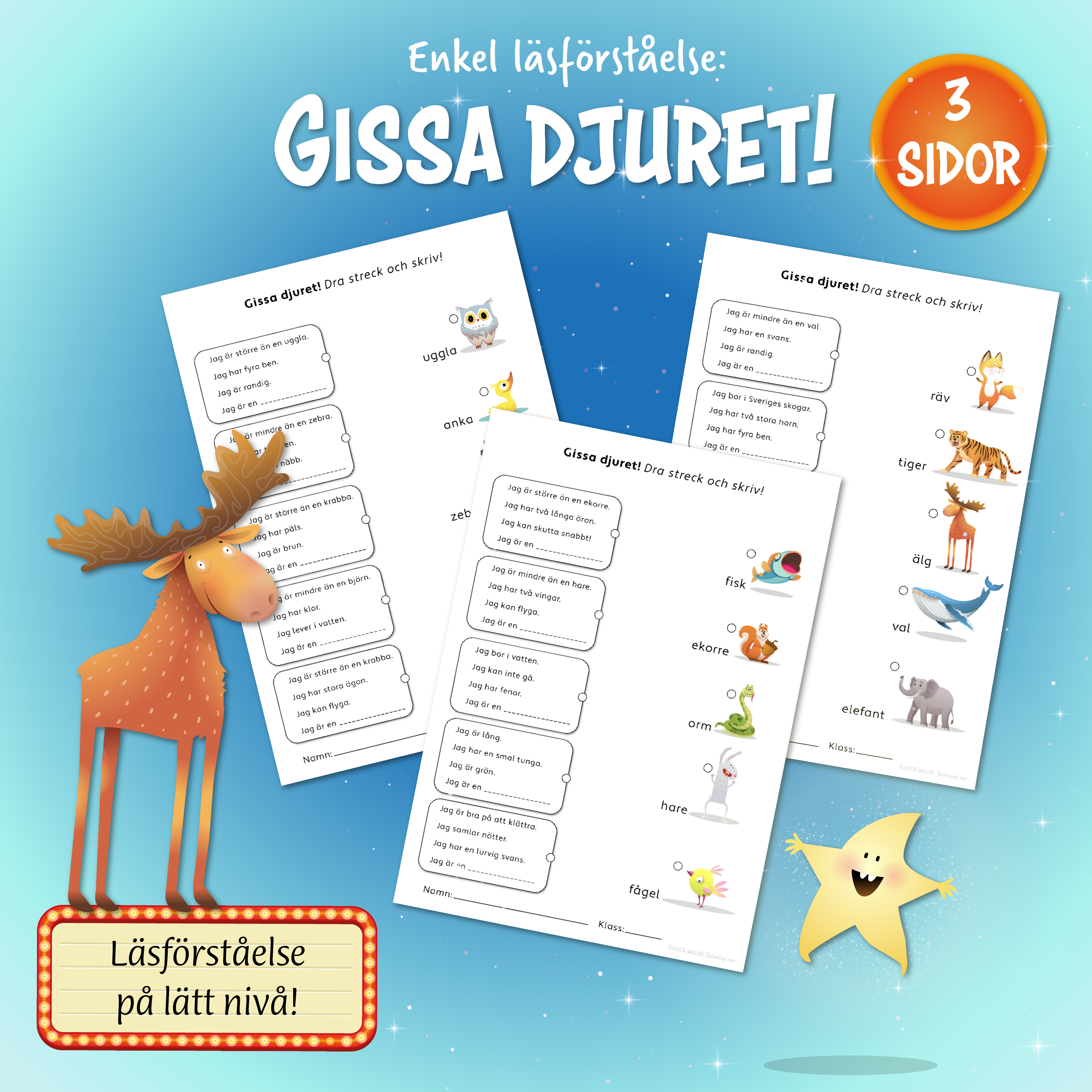 3 sidor läsförståelse ”Gissa djuret” att ha som extrauppgifter i klassrummet, eller använda som lektionsmaterial att utgå ifrån och bygga vidare på. Eleverna läser faktarutorna och drar streck till rätt djur utifrån den beskrivande texten och skriver djuret på raden i rutan. Enkel läsförståelse!
