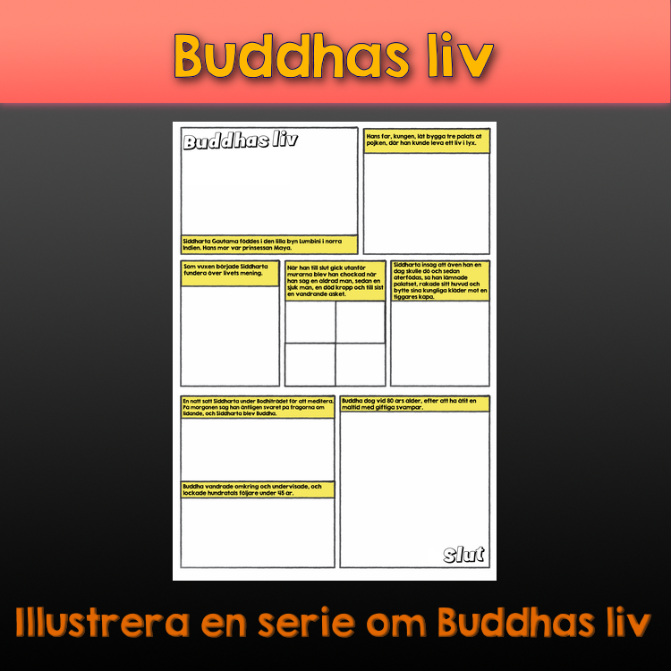 Det här är en kreativ övning där du använder en seriestrip för att lära ut Buddhas liv. Eleverna får en interaktiv och rolig upplevelse samtidigt som de bearbetar informationen på ett minnesvärt sätt. Det är också bra att inte kräva att studenterna skriver något, vilket kan minska tröskeln för dem som kanske inte är bekväma med skrivuppgifter.