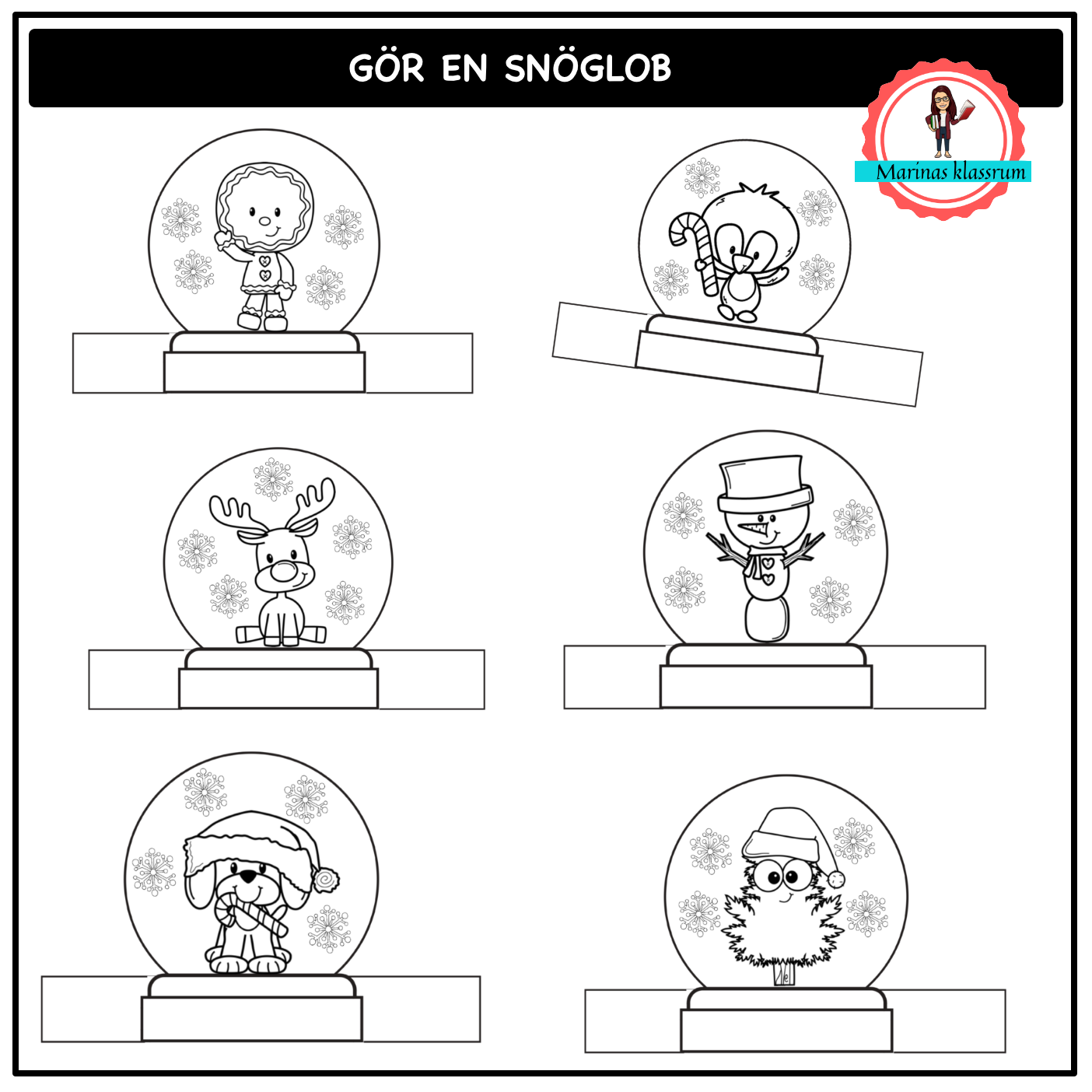 6 olika mallar att skriva ut och låta eleverna färglägga. Klipp sedan ut dem och vik remsan längst ner och limma ihop den så får du en fin snöglob att ställa i fönstret.