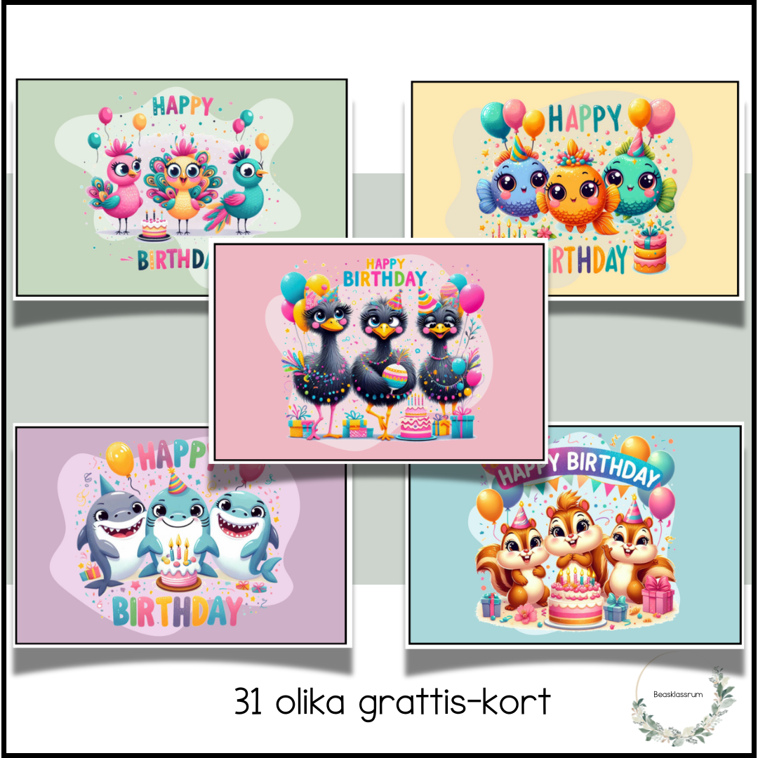 Grattis-kort, 31 stycken olika med 5 olika bakgrunder