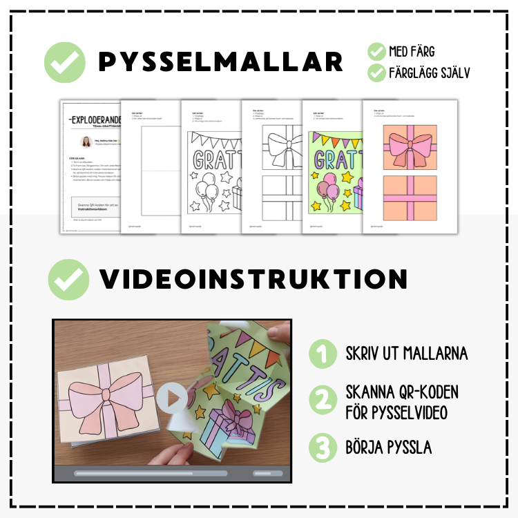 Pyssla ett exploderande grattiskort till födelsedagen. När omslaget öppnas vecklas kortet upp. Skriv ut med färg eller svartvit variant för att färglägga själv.