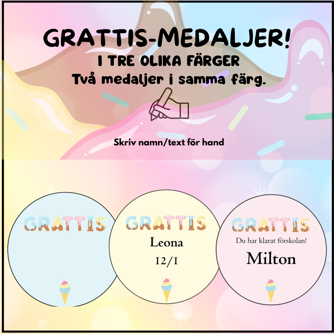 Grattismedalj till alla tillfällen. Skriv namn/text för hand. Finns en version där du redigerar namn/text i dator. Finns i min butik.