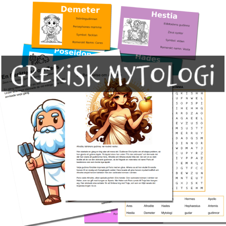 De första 26 sidorna kan skrivas ut och göras till ett häfte för eleverna att arbeta enskilt, i grupp eller klassvis med. s. 27 är Facit till korsordet, och s. 28-30 är färgglada kort att klippa ut med fakta och bilder om 13 av de grekiska gudar och gudinnorna.