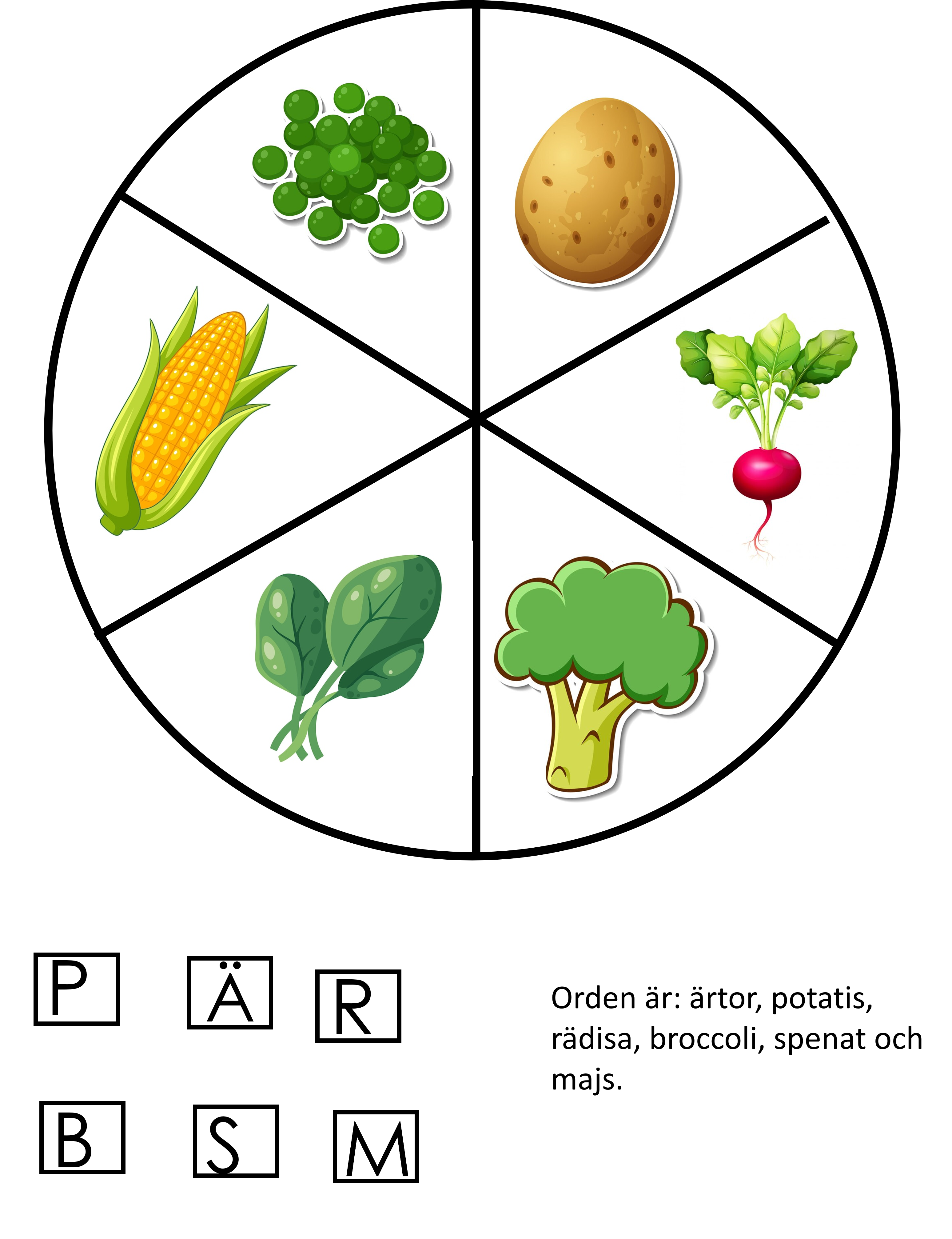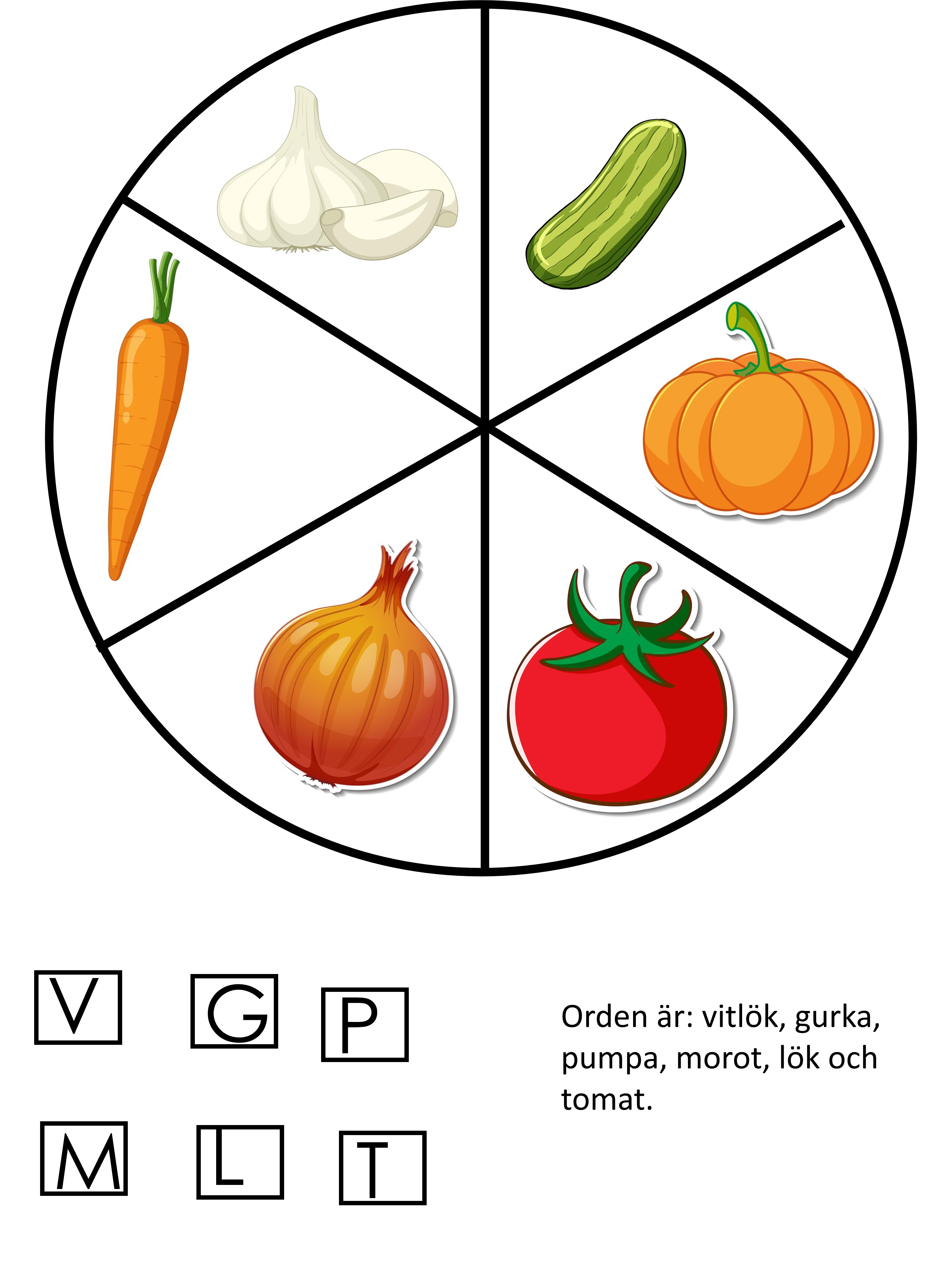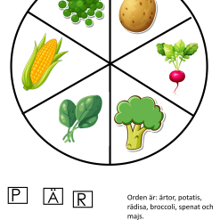 Materialet innehåller 3 hjul med bilder på grönsaker. Samt små lappar med bokstäver som du klistrar på klädnypor.