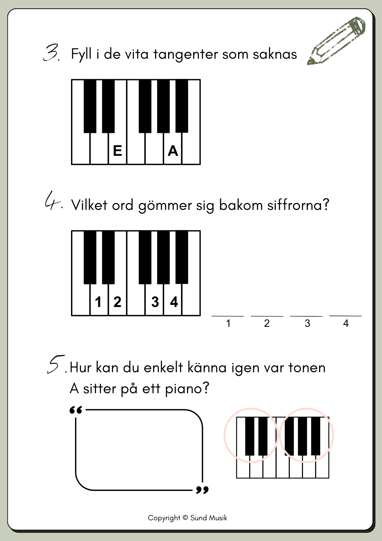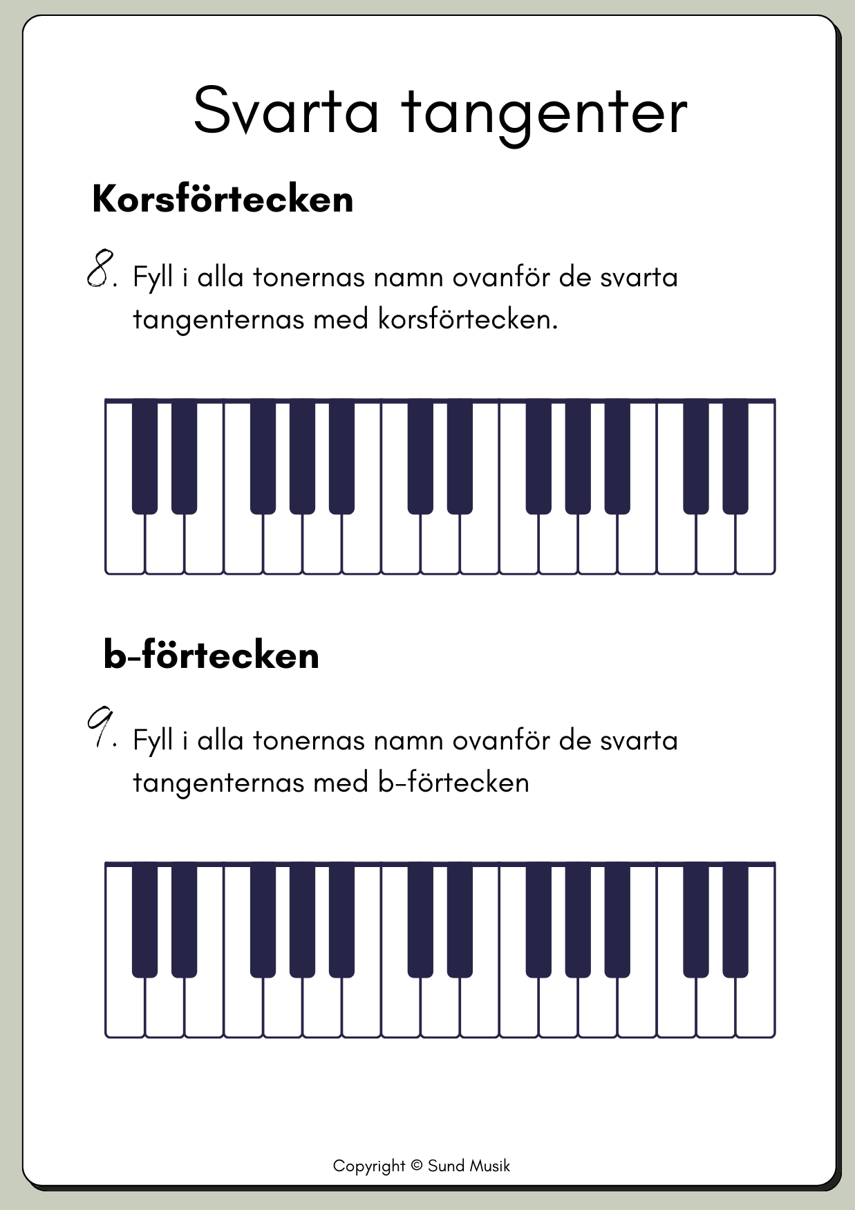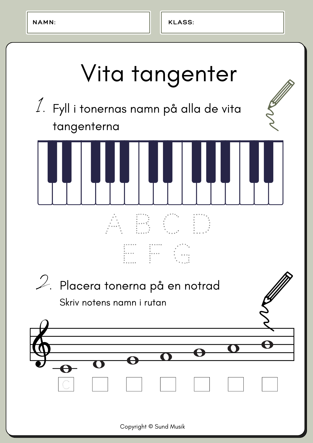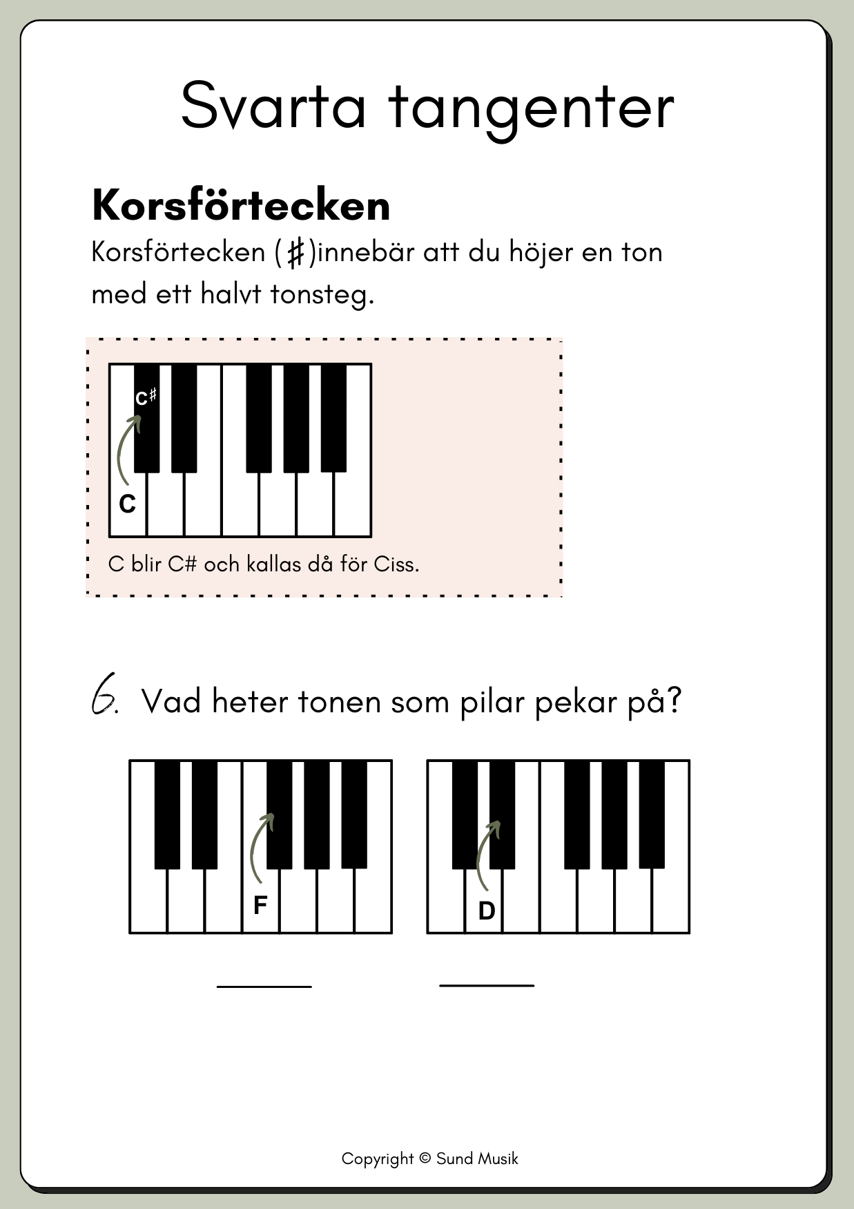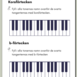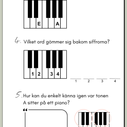 Ett kompakt och pedagogiskt arbetshäfte där eleverna får träna på att känna igen och namnge pianots toner. Häftet täcker både stamtonerna och de svarta tangenterna, och innehåller enkla teoretiska övningar för att förstärka förståelsen. Dessutom får eleverna öva på att placera ut toner på en notrad, vilket knyter samman spelandet med notläsning. Det här häftet är utmärkt för pianoundervisning i grupp, klass eller individuellt och är ett perfekt verktyg för att introducera grunderna i piano.