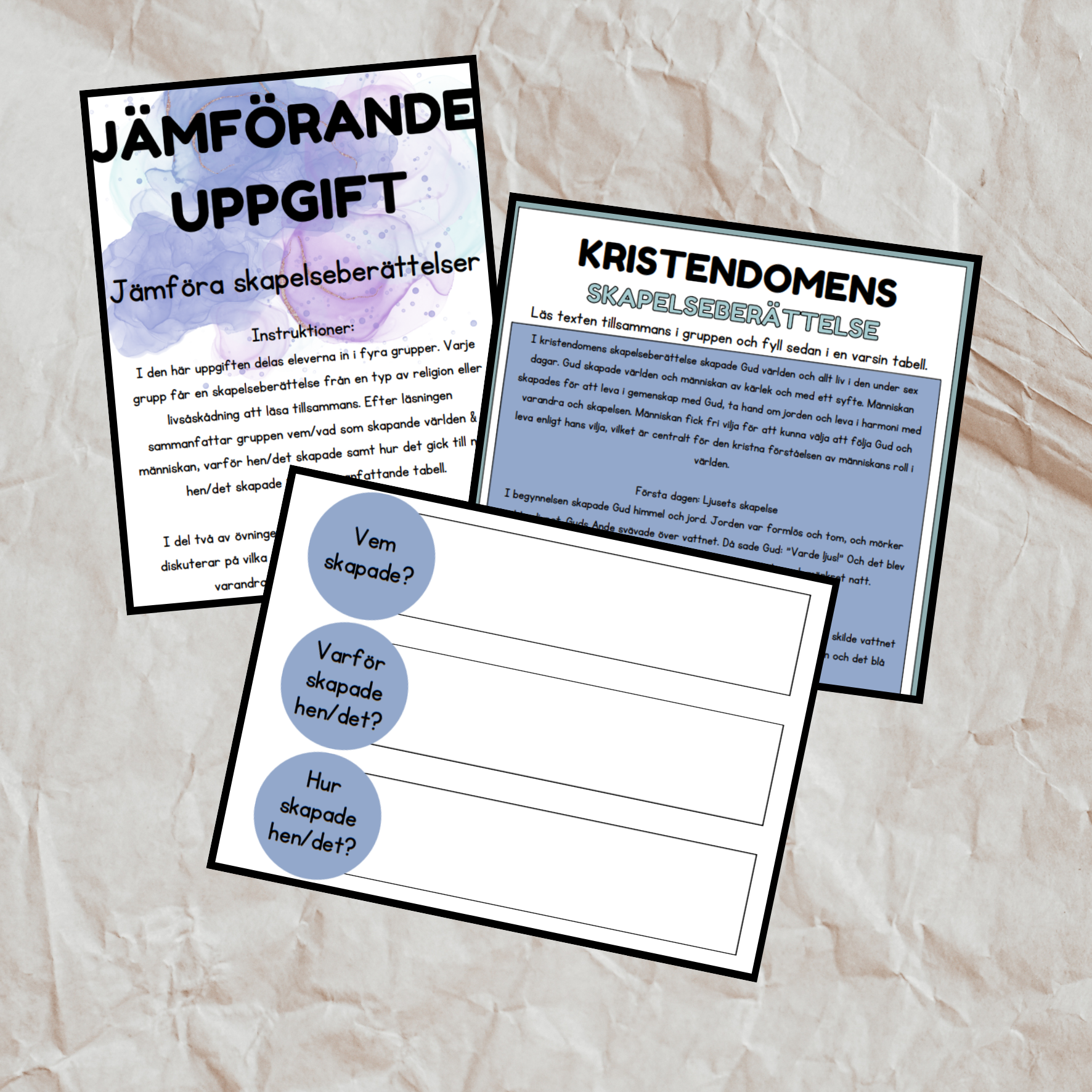 En arbetsuppgift inom religion där eleverna arbetar i grupp och jämför skapelseberättelser från kristendomen, evolutionsteorin, asatron och grekisk mytologi. Syftet med uppgiften är att öva på att hitta likheter och olikheter samt diskutera hur en skapelseberättelse kan påverka individens syn på religion/livsåskådning.