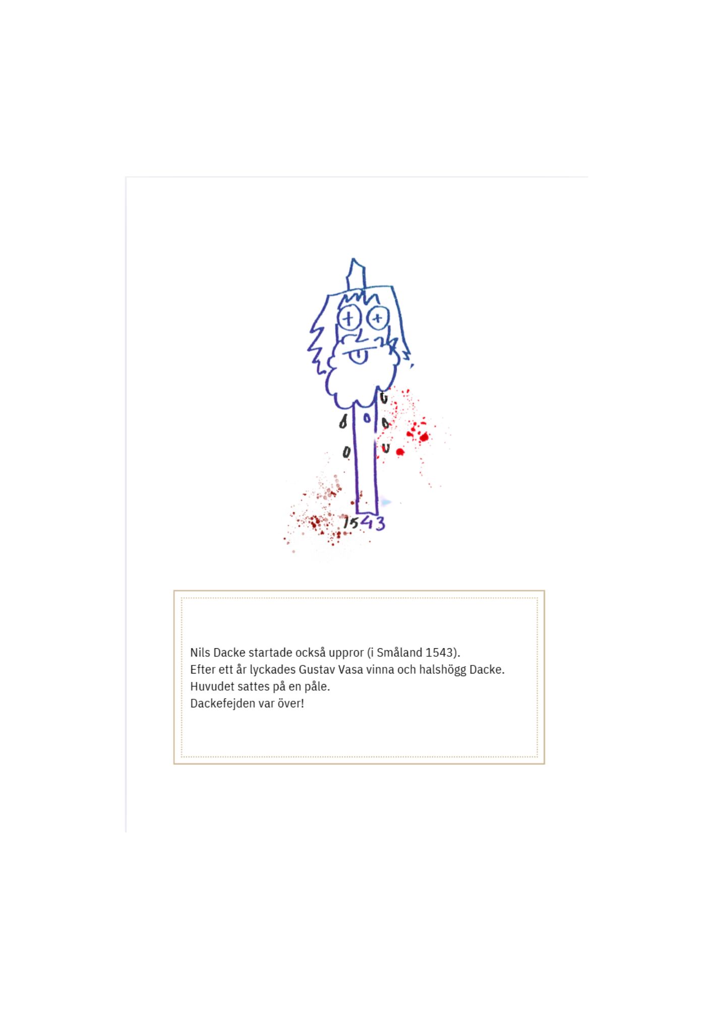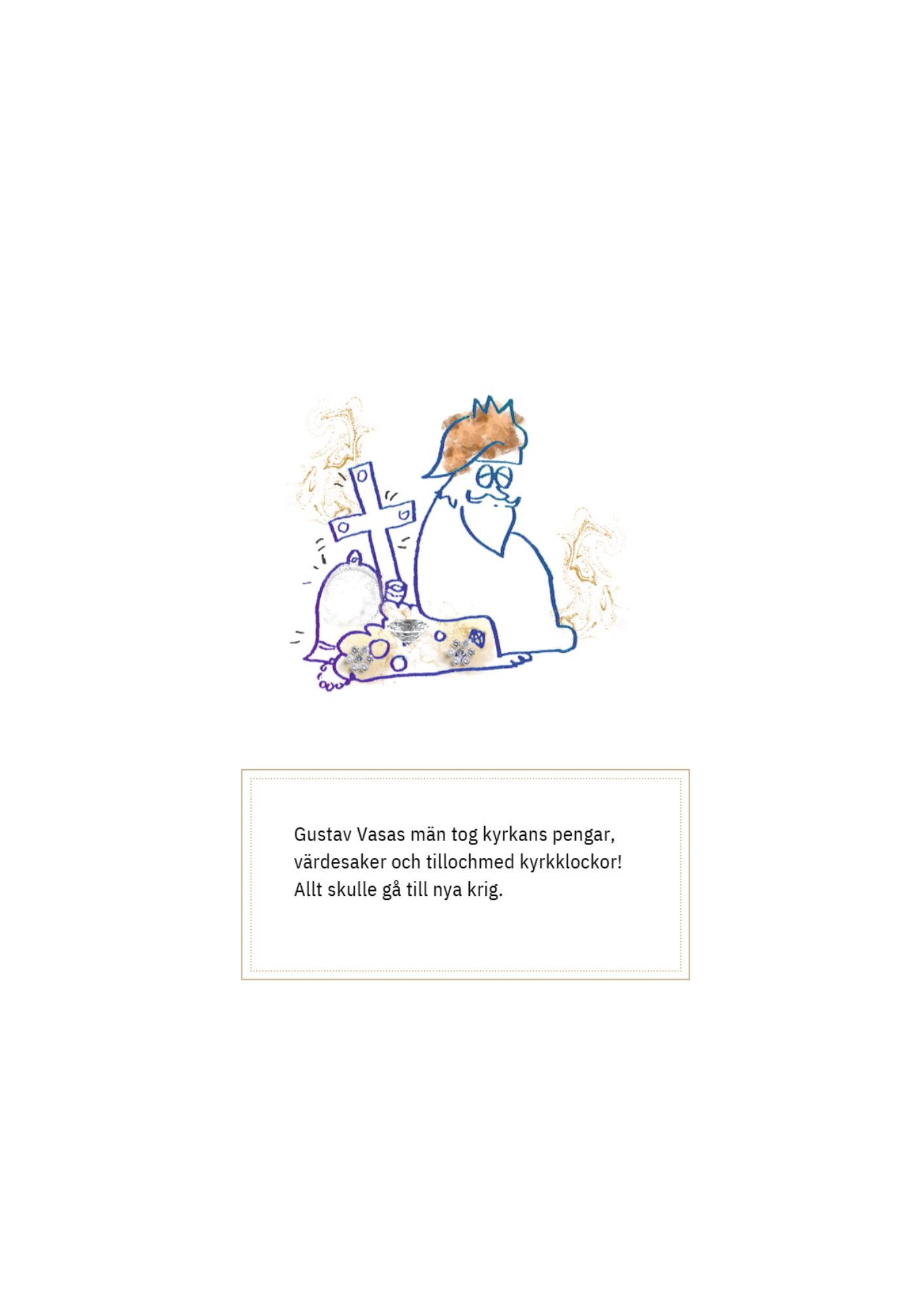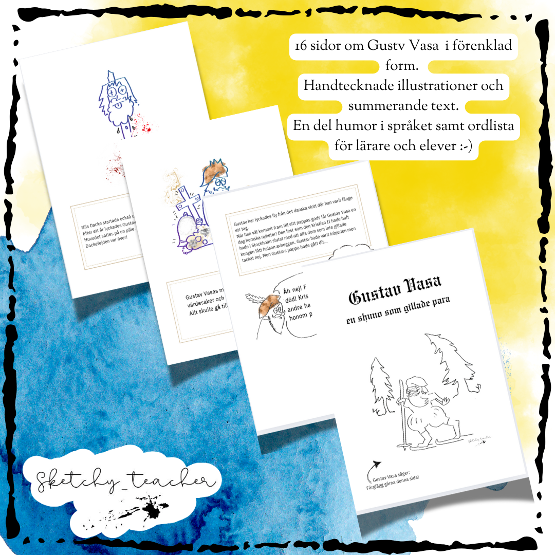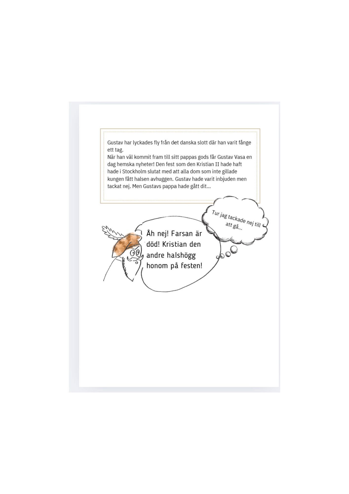 Ett häfte/bok som summerar; med hjälpa av kort text och lättsamma illustrationer, om Gustav Vasa från det att han rymde från Danmark till att Dackefejden var över.