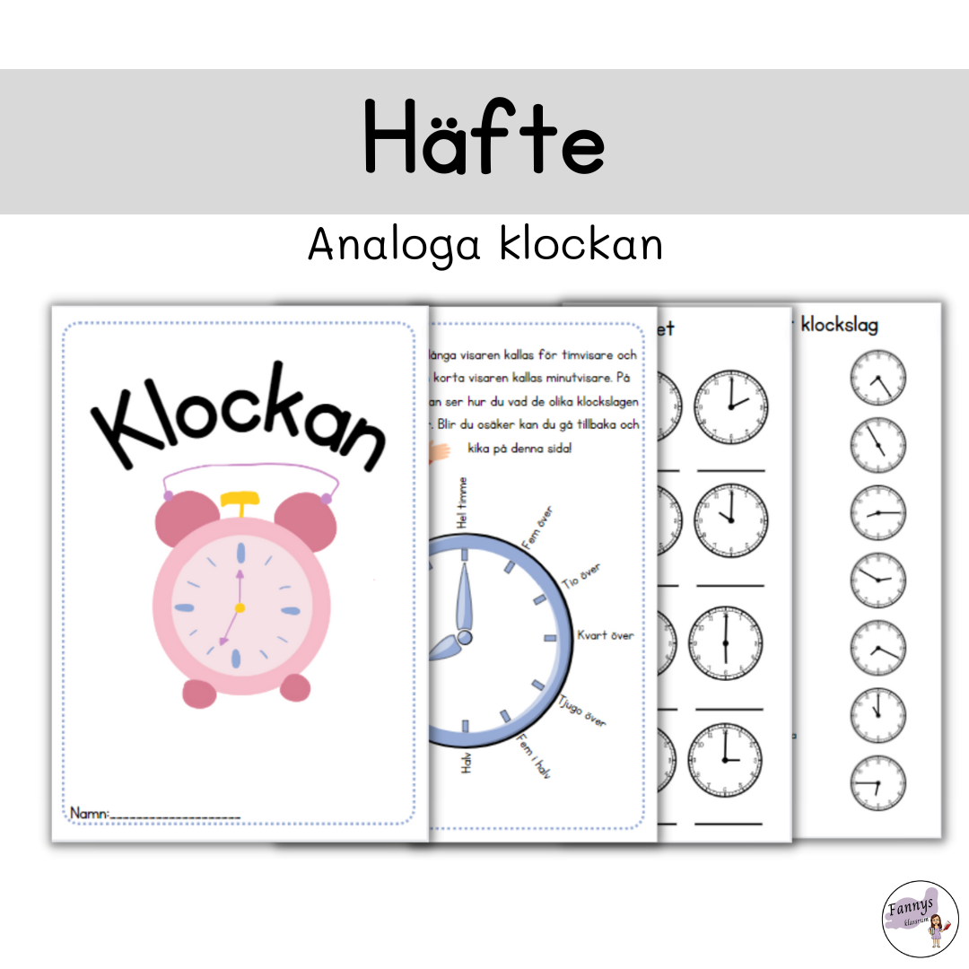 Arbetshäfte på 21 sidor med den analoga klockan. Eleverna får träna på att skriva klockslag, rita minutvisare och timvisare efter ett givet klockslag samt dra streck mellan rätt klockslag och klocka.