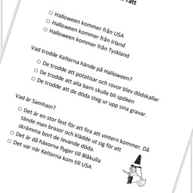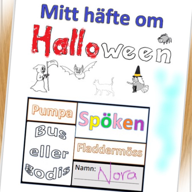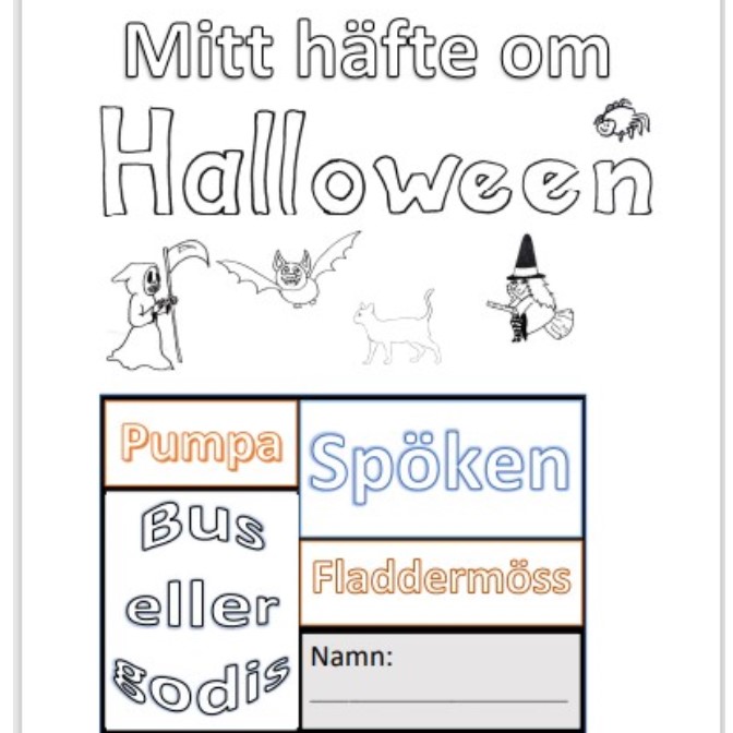 Ett häfte på 10 sidor med fakta om Halloween, lästförståelse, matteuppgifter, ordgömma, korsord, rituppgift och skrivuppgift. Alla illustrationer är av skaparen.