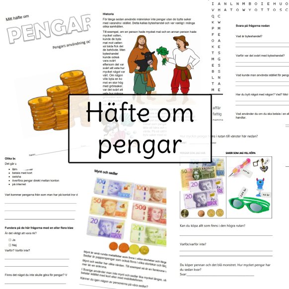 Ett häfte på 8 sidor om Pengar. Eleverna kan arbeta enskilt eller i mindre grupper med häftet som går att skriva ut svartvitt eller i färg.