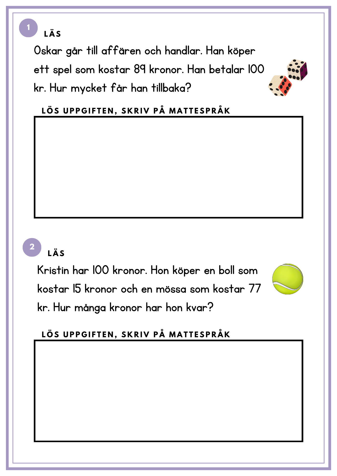 Häfte om totalt 30 olika uppgifter för att träna problemlösning / textuppgifter addition och subtrakton 0-100. OBS, några av frågorna är samma/lika som mina problemlösningskort (nivå 3), men här alltså som ett häfte. Många nya frågor också.