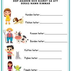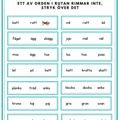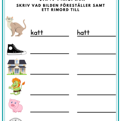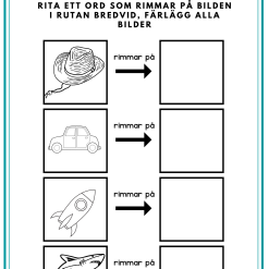 Ett häfte med rimord. 9 sidor totalt med framsidan. Olika lättsamma övningar där eleverna tränar på att höra och se vilka ord som rimmar. Passar f-3.