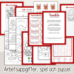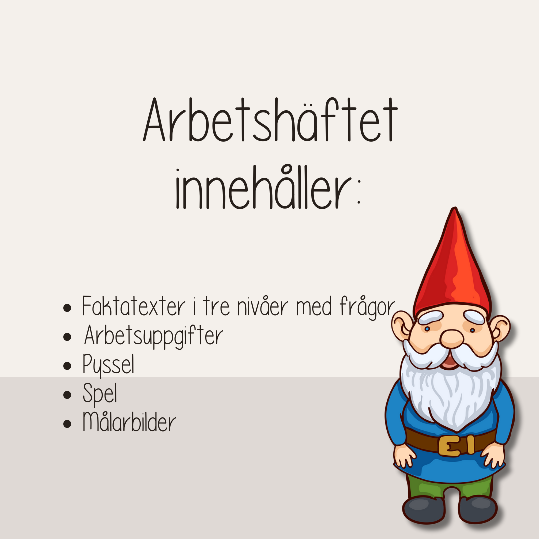 Ett arbetshäfte med faktatexter om tomten i tre olika nivåer. Faktatexter med tillhörande frågor, arbetsuppgifter, spel och pyssel – allt med tema Tomten!