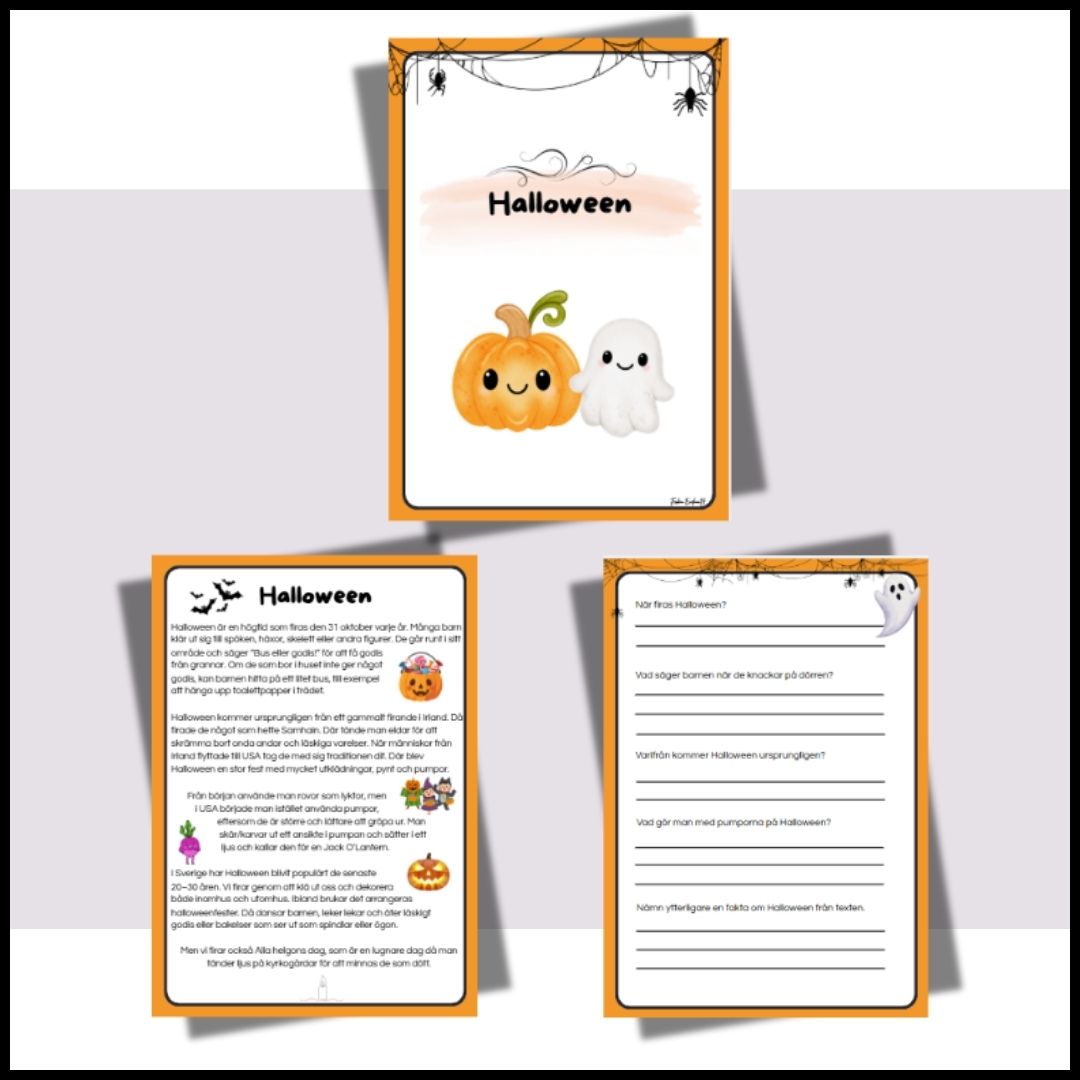 Läsförståelse/faktatext om Halloween med tillhörande läsförståelsefrågor + skriva en faktatext.